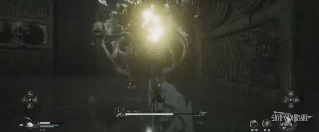 积攒棍势使用重击将其破防,基本三重棍一破防,主要打妙音头上的铁球打伤害。在妙音的血量降到三分之二时会触发一个涵盖全图的技能,此时玩家不仅要躲避妙音的射线,还要时刻观察地面的分裂的板块,我们需要在地面的印记发红爆炸之前站在某一个地块上规避伤害。