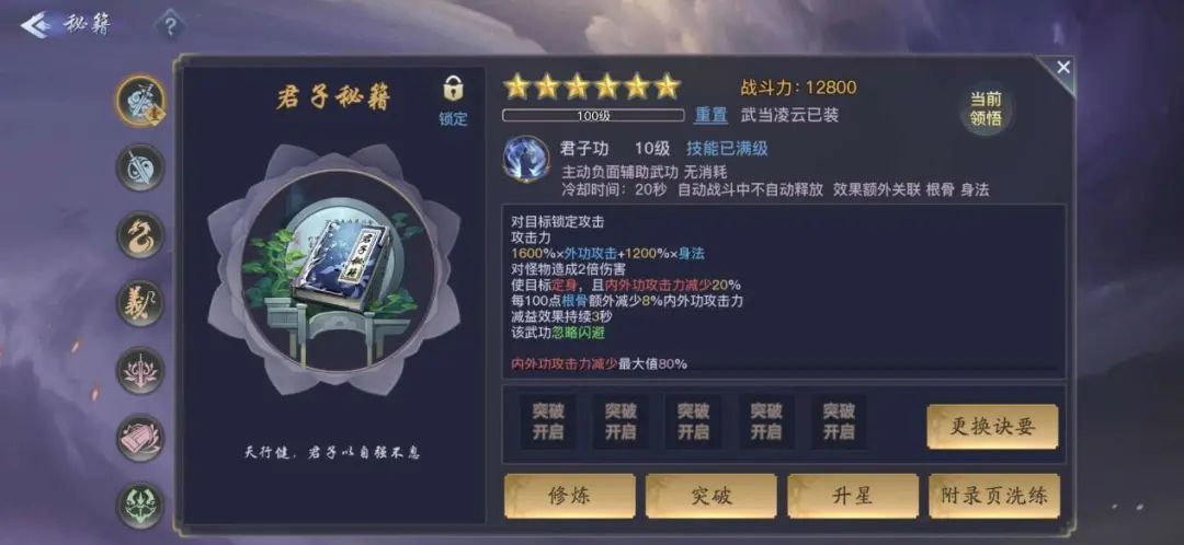 <登峰造极>:推荐武当凌云的专属秘籍——君子秘籍。附带高伤害,控制效果的技能,对敌人造成高额伤害的同时,还能使敌人定身,且减少其攻击,是标准的先手控制技能,并且忽视闪避。君子秘籍也是凌云流派目前的最佳秘籍选择,甚至比出神入化的秘籍作用还大。