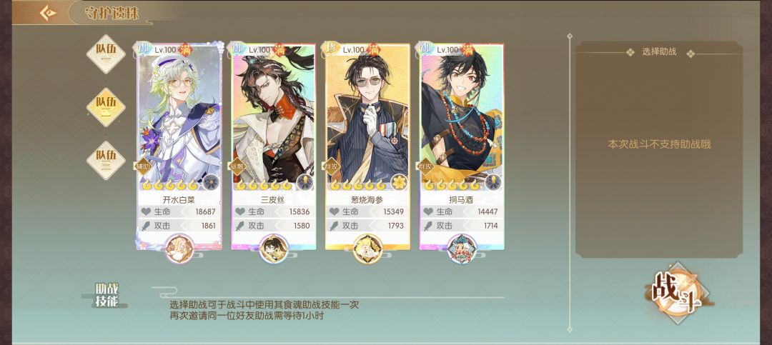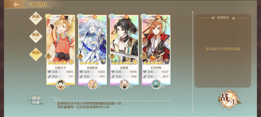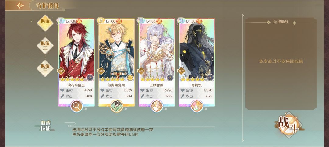 阵容一般是:辅助+三群攻,第三队的练度最高,可以先配第三队,剩下的群攻配另外两队。