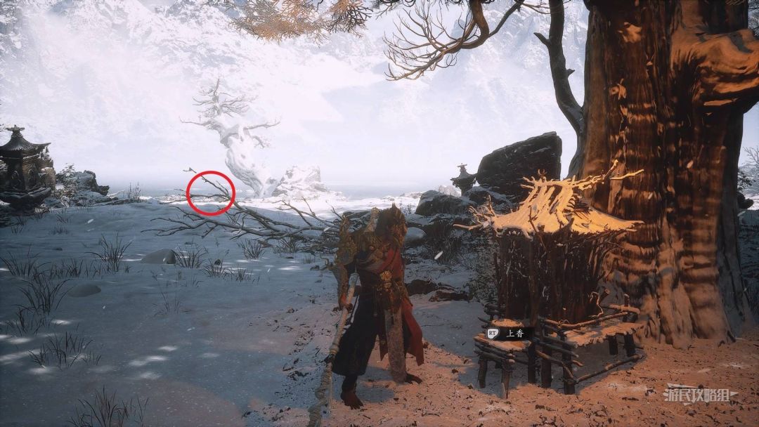 从第三回【雪山径-照鉴湖】篝火出发,走到巨大的冰湖边,冰湖边有一颗被雪覆盖的树,蒲团就在树下。没有打完第三章时,湖面上会有亭子,打完第三章后亭子会消失。