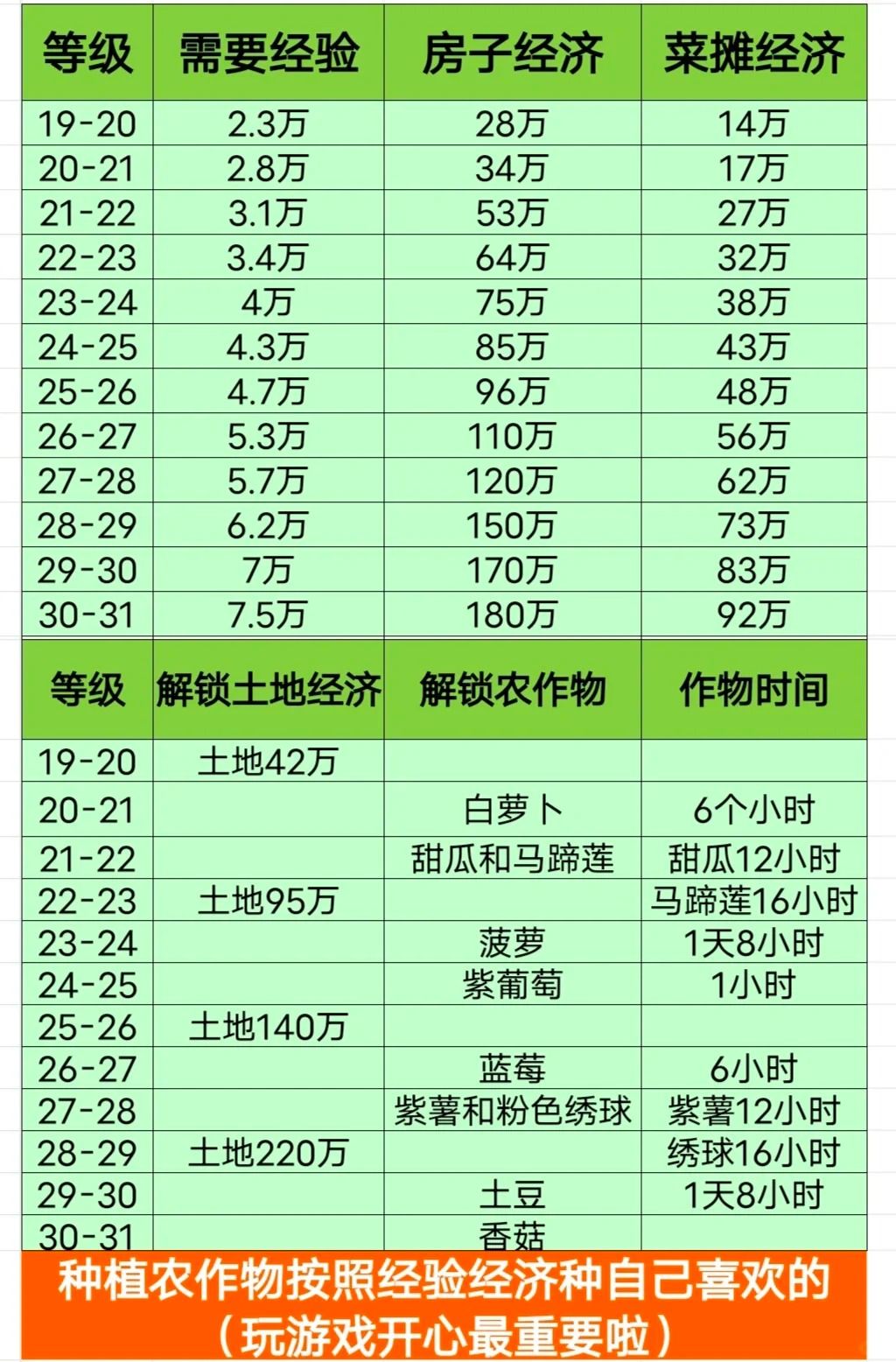 1⃣P2是从19升到31级所需要的经验经济和新增农作物,土地所需经济总结