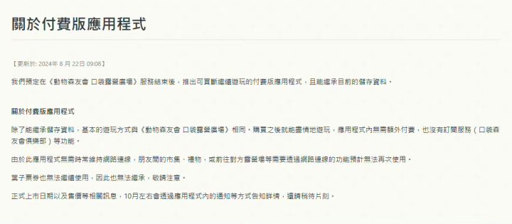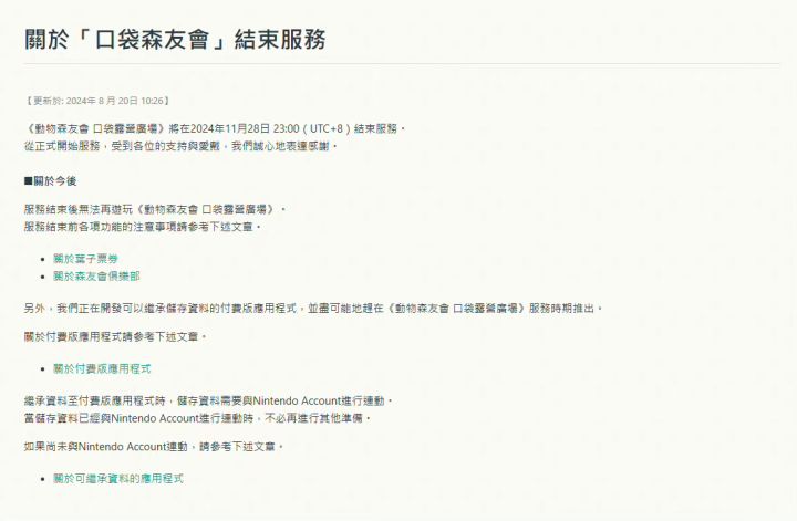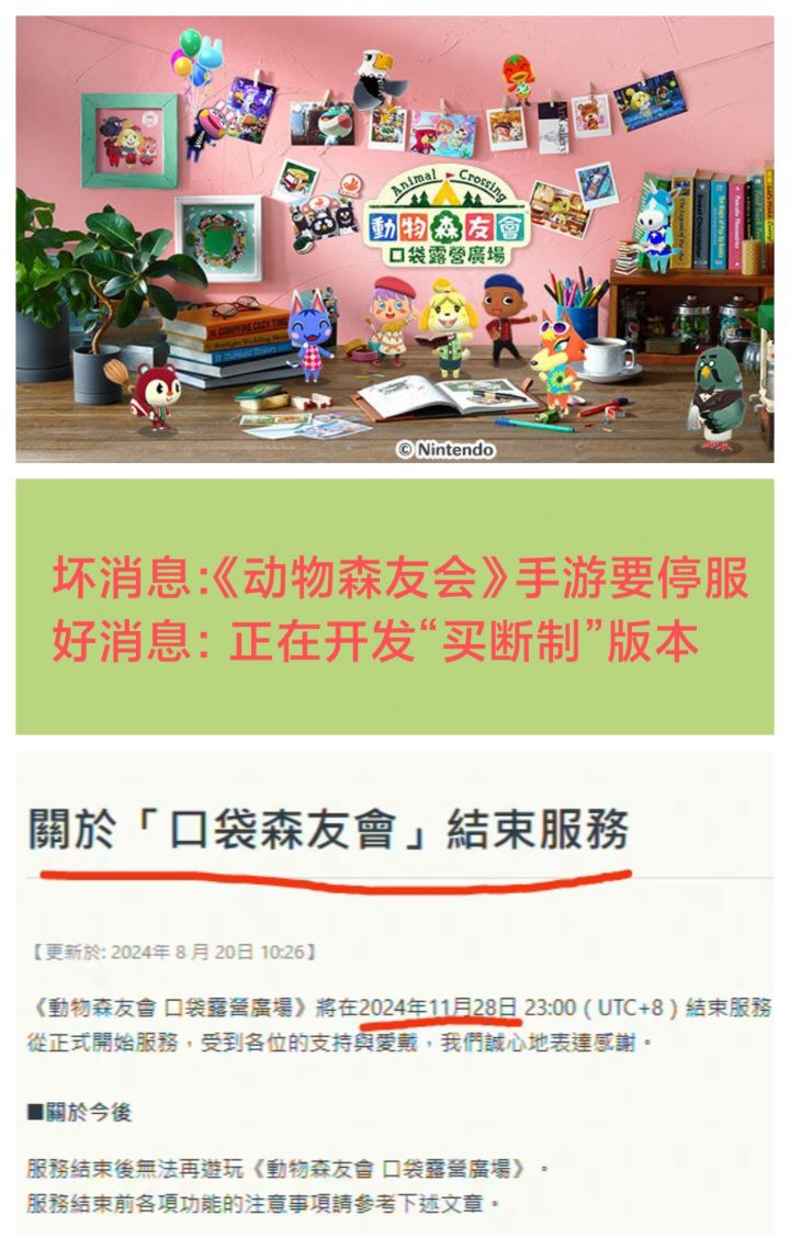8/20号上午,任天堂官方宣布,动森手游《动物森友会:口袋露营广场》将于11月28日停服