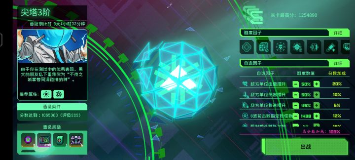 百分之50血量大概算是最划算的血量增加,如果镀层高的话我感觉可以尝试75血量加成,。为什么不拉满血量分数,因为再额外加100的血量才增加百分之八的分数,但是对于镀层低的不友好,因为打不动怪了就。波数的满分数我打不到满,这个数量是能打到,超一点,但是到不了下个分数。这把纪念品不算很好,如果全部都来适合的纪念品,应该还能再涨几万,因为最后打boss剩下八九分之一的血量。