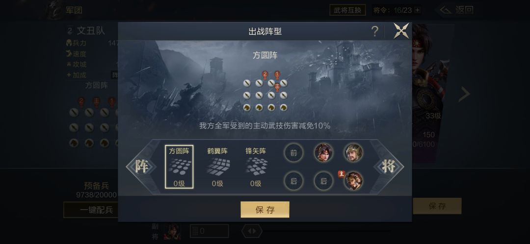 前期我们不追求武将经验,而是怎么省兵怎么打,战损越低越划算,追求的是速度占领地,前期打地经验也不咋滴,没必要,五级地以前武将基本上在右前方,我们可以选择对主将集火,主将兵力死亡,战局就结束了,所以我们站位时候一定要针对敌方主将,保护自己的主将,阵型站位如图。