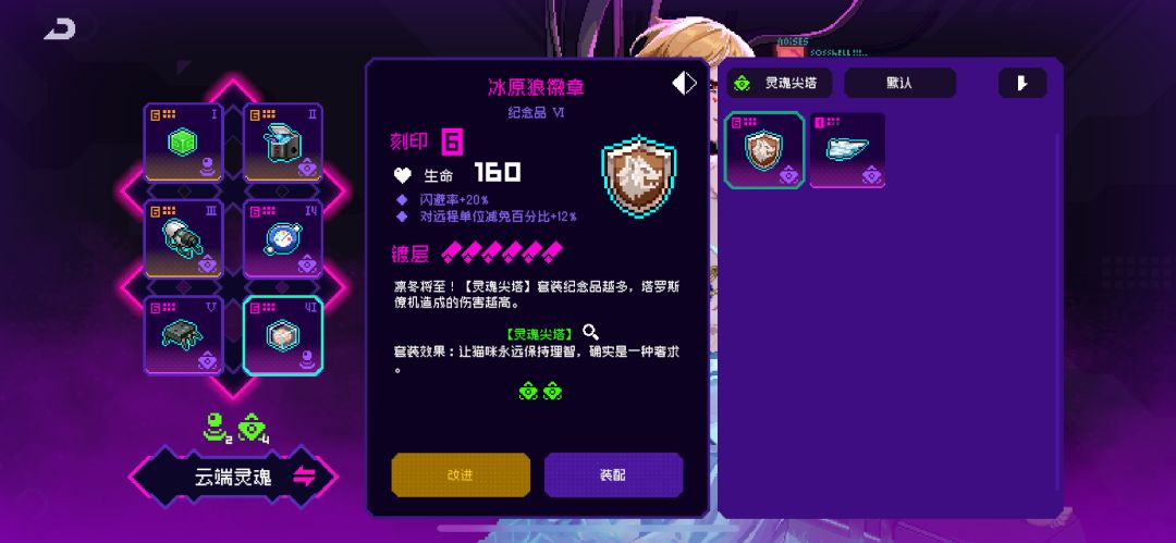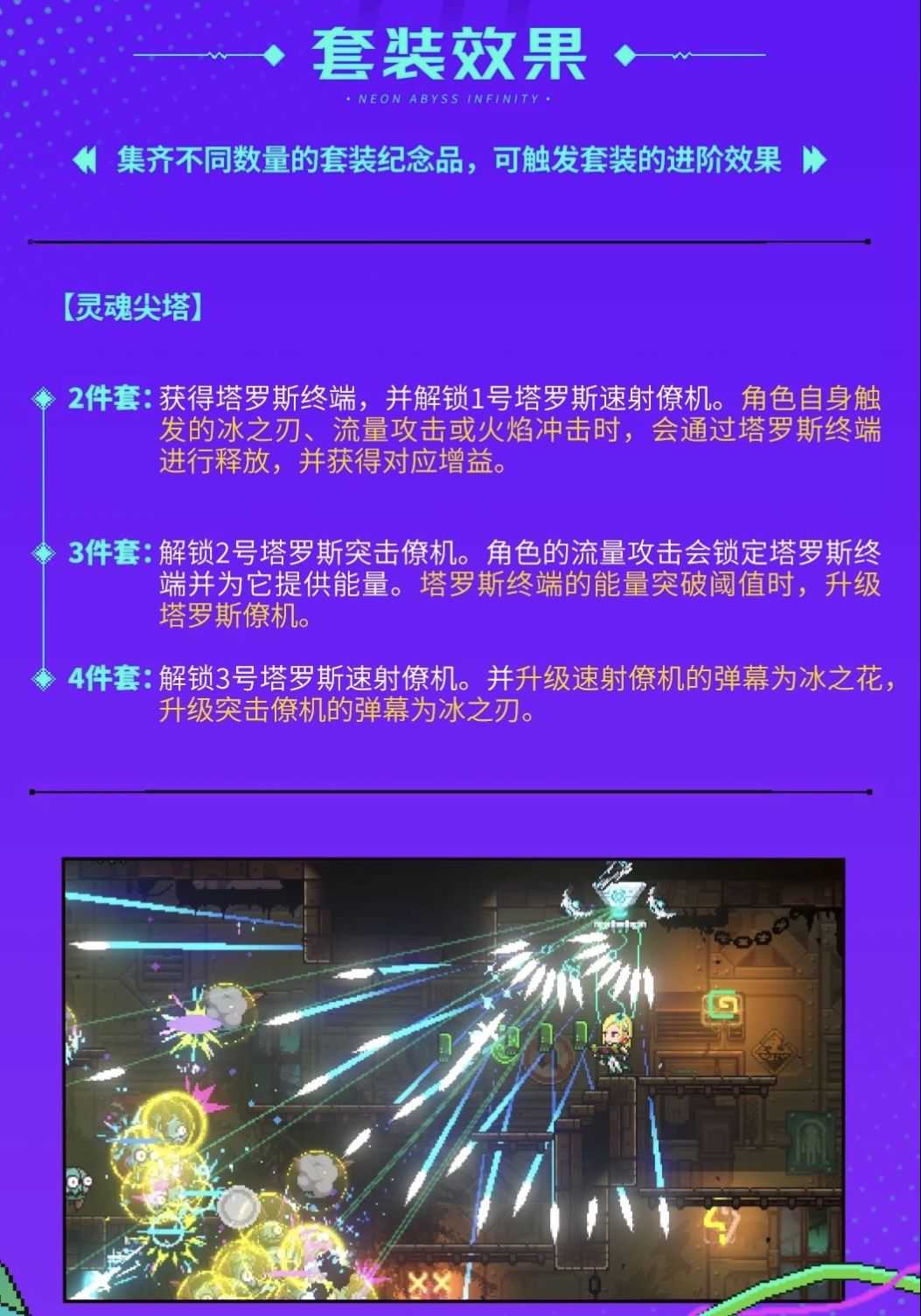 【灵魂尖塔】不同于其他属性流派,没有真正意义上的绝对核心纪念品(比如【节奏大师】的碎片项链、【深渊行者】的火龙芯片就属于绝对核心纪念品),想要完美发挥出【灵魂尖塔】的效果就需要多件灵魂尖塔纪念品叠加,从而解锁1/2/3号塔罗斯僚机(最多3架),并将弹幕升级为冰之刃/冰之花。