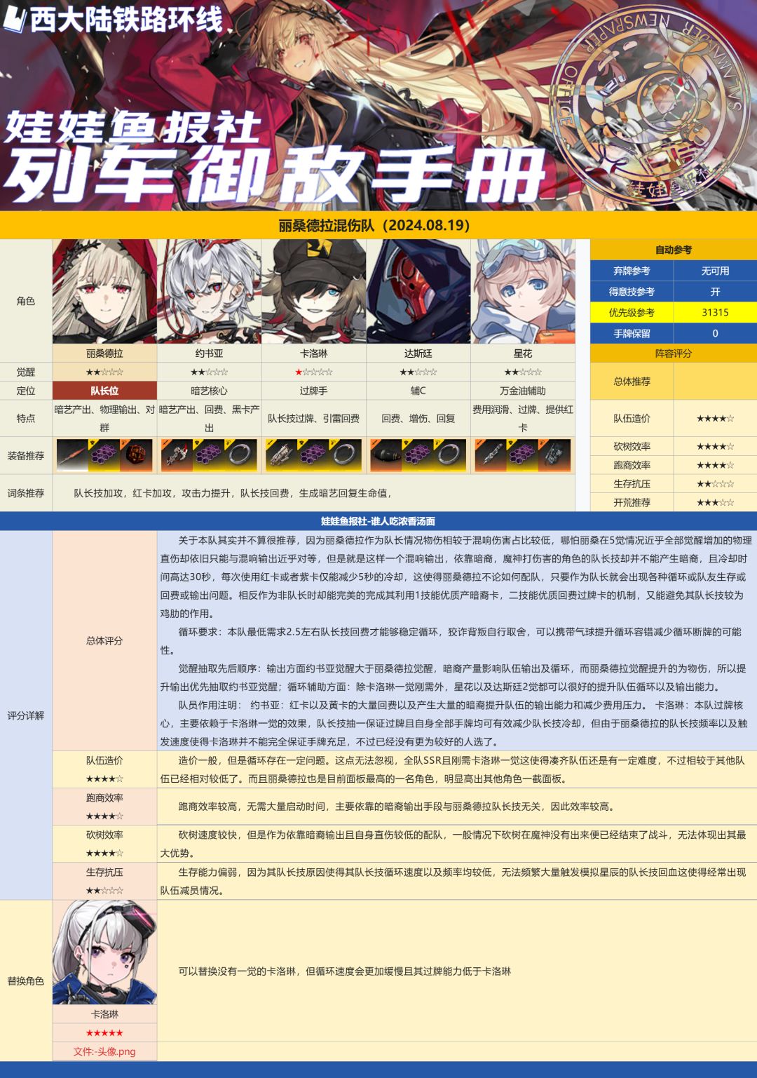 丽桑是一位兼具红卡和紫卡体系的角色,自身伤害类型为物理伤害同时能产出具有混响伤害的暗艺卡牌,因此其队伍的伤害类型是混伤队伍。然而作为队长时,丽桑的物伤占比其实并不够高,仍然以混响输出为主,而且存在队长技刷新慢的问题,生存和循环总有一个会出现问题,实际上强度只能说中规中矩。综合来说,丽桑队长的队伍,只推荐萌新抽0觉当队长开荒用,或者真爱党无所畏惧为她打榜!
