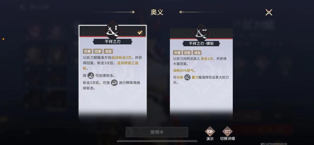奥义介绍:消耗55%的怒气释放一次高额回复的斩击,此奥义可以蓄力,蓄力后可以挥砍出范围更广的刀刃。如果你偏爱落地架,那么这款奥义十分的适合你。