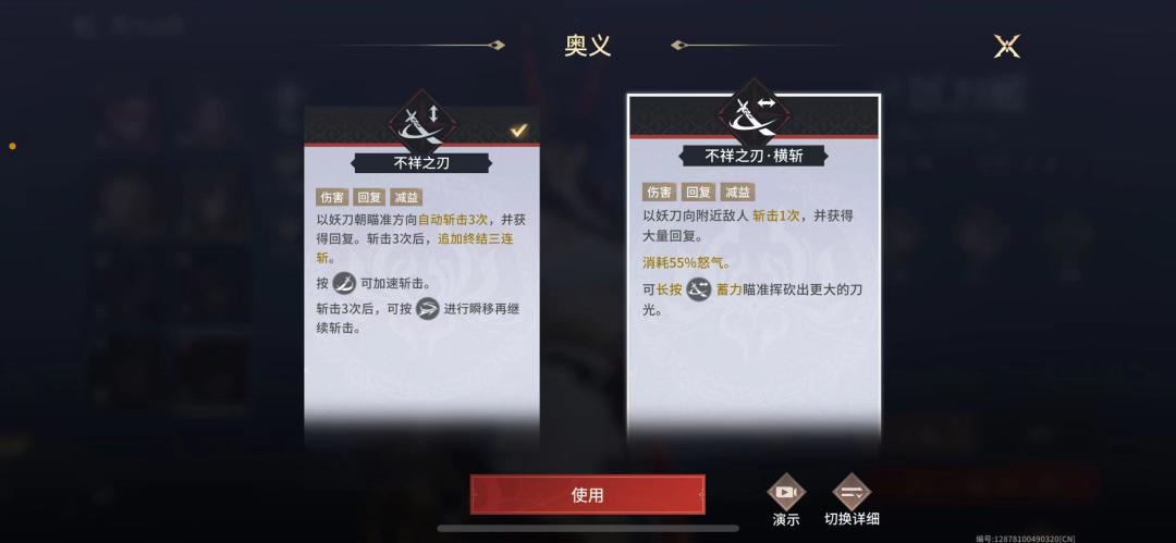 奥义介绍:不详之刃是一款拥有高伤害的奥义,并且会对命中的目标造成70%的减治疗效果,且会对命中目标造成大量僵直。对大佛岳山有着极其克制的功效,前三刀的连续斩击可以对大佛岳山造成大量的伤害以及僵直,极其推荐多排中携带此技能。