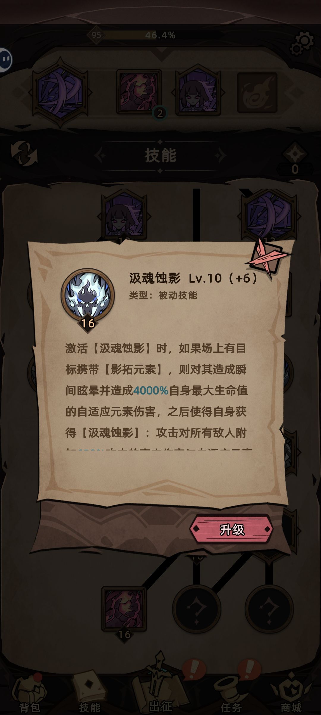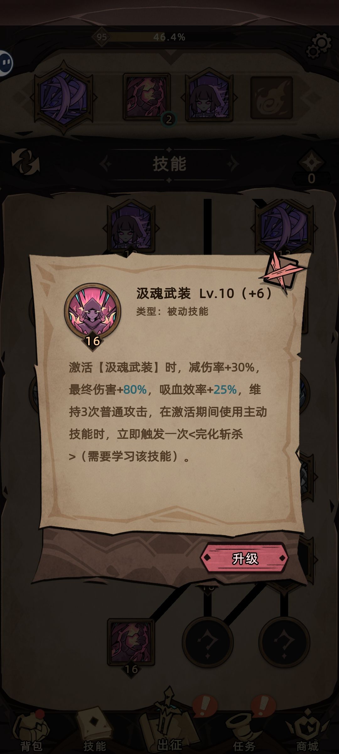 汲魂武装 和 汲魂蚀影 。这两个技能很关键,当然,要把这两个技能升满了,实际上,魂术士要进入无敌状态,需要升满的技能并不多,如下图: