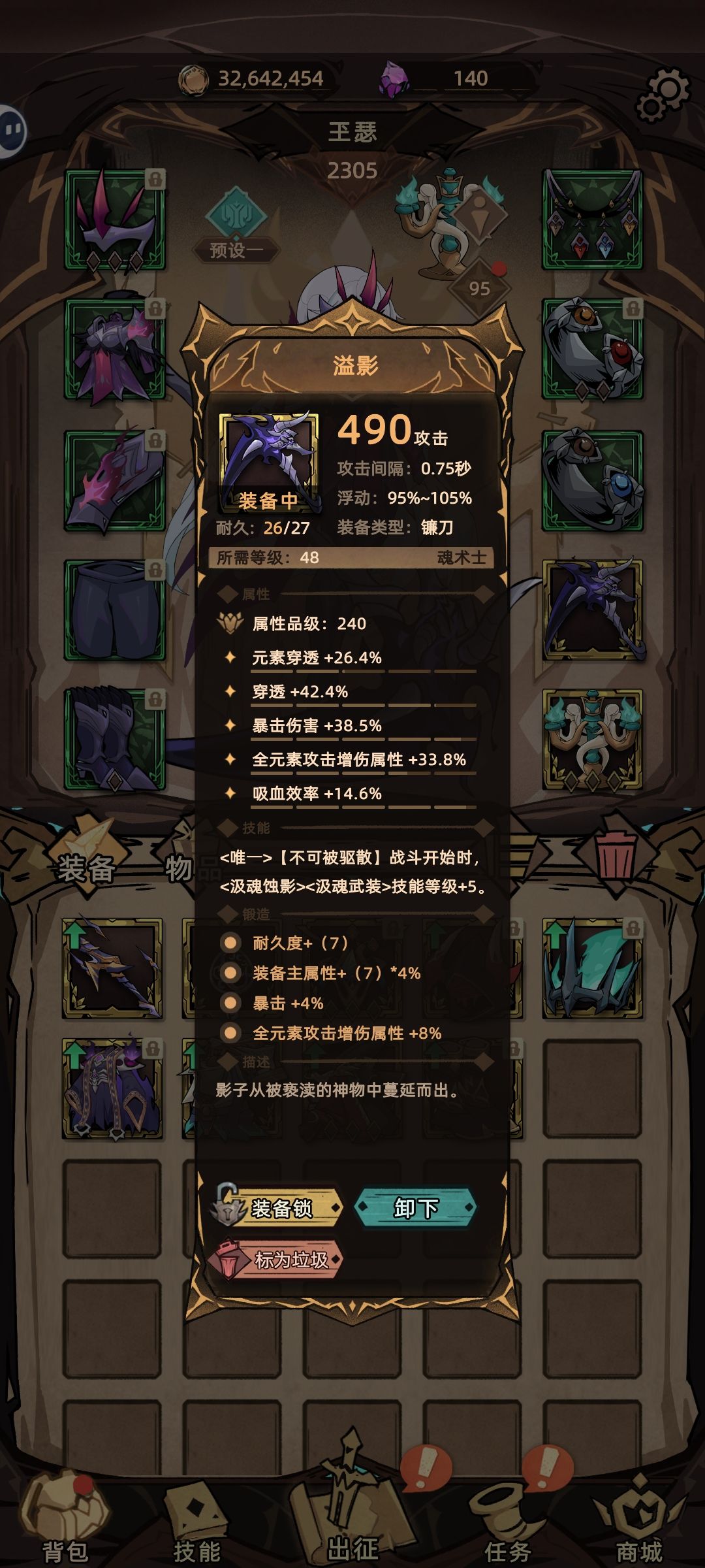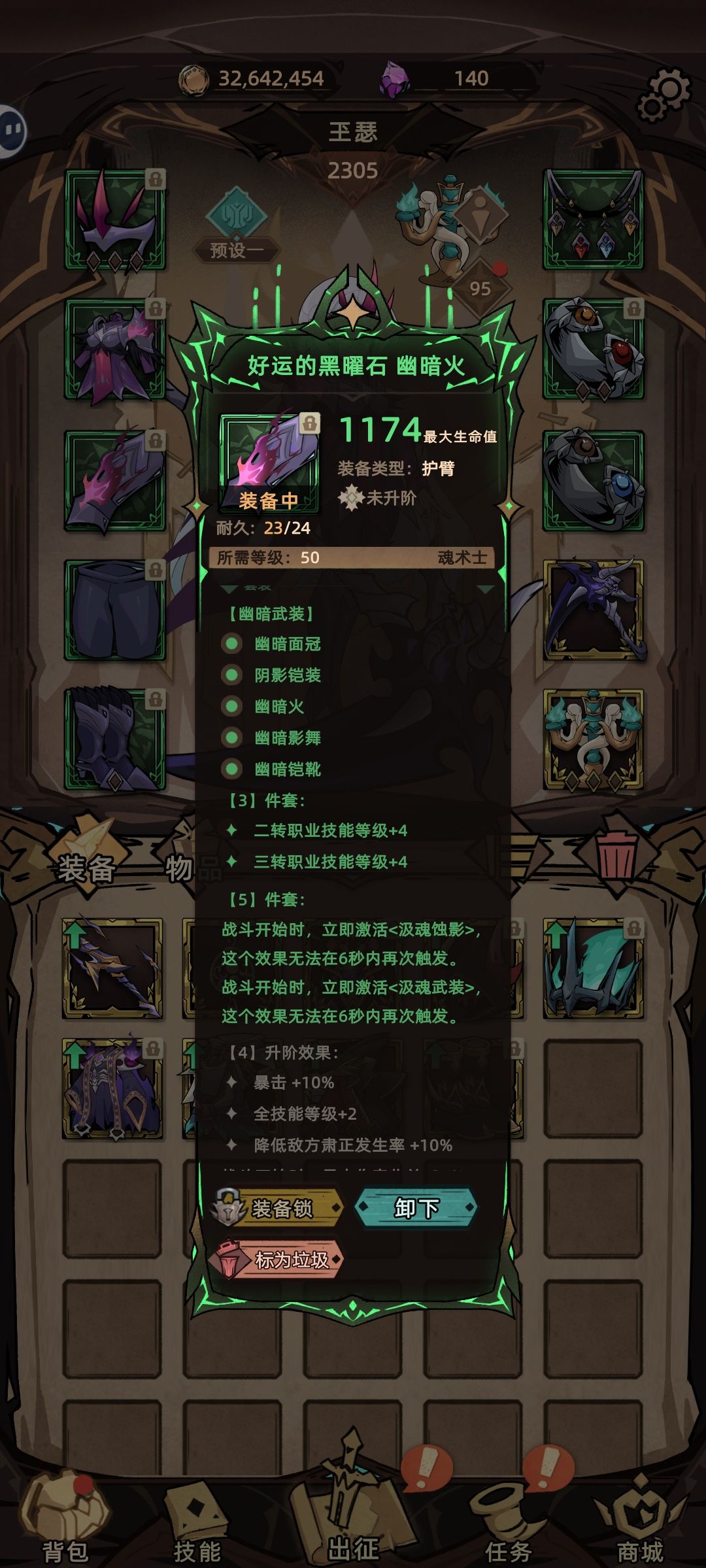 这个 幽暗武装 套装也是无敌的关键,二转三转技能等级+4,战斗开始时,自动触发 汲魂武装 和 汲魂蚀影。