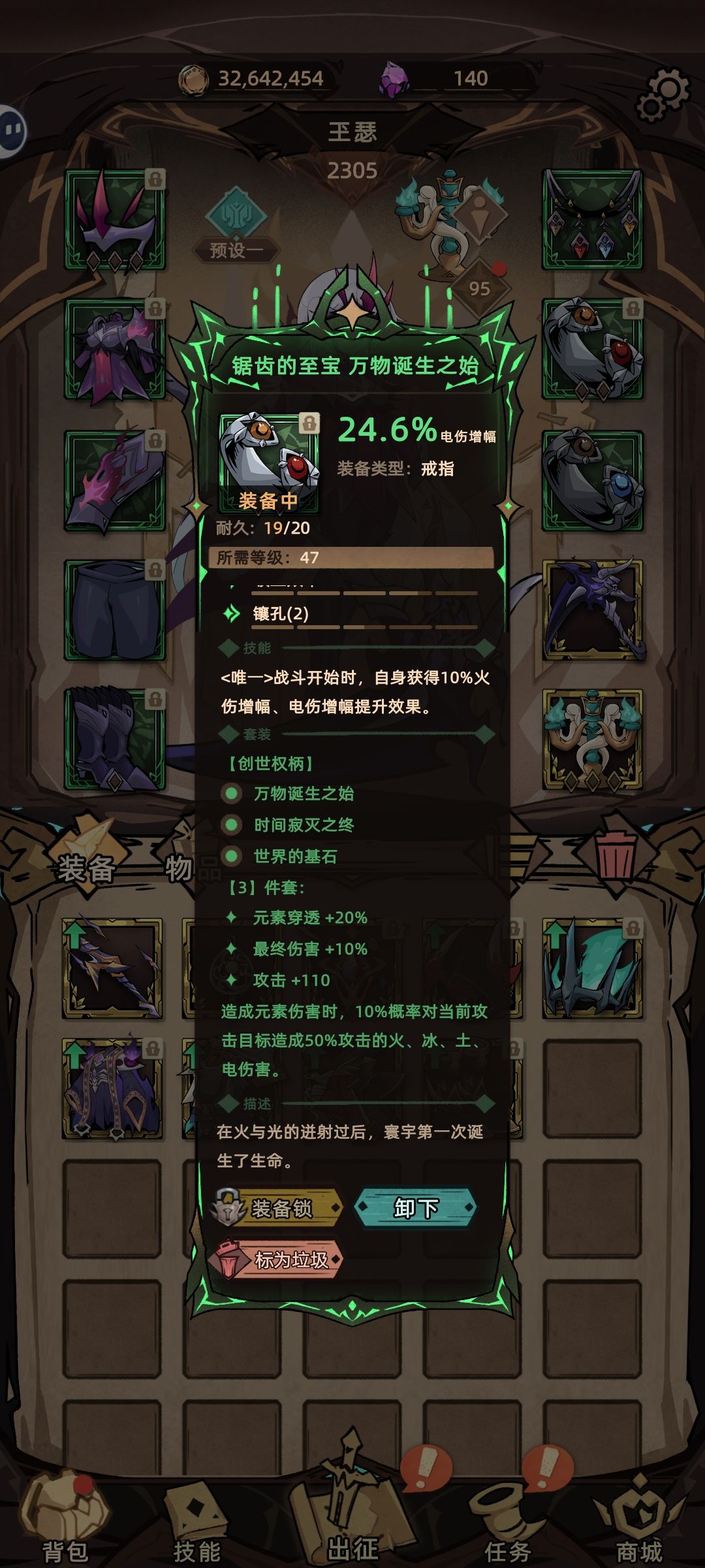 为了更完美一点,再加上另一个 创世权柄 套装,它只有三件套,容易获全,如下图: