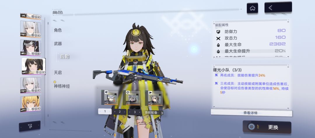 配队上除一般增益拐,小金鱼可以带曙光小队减抗