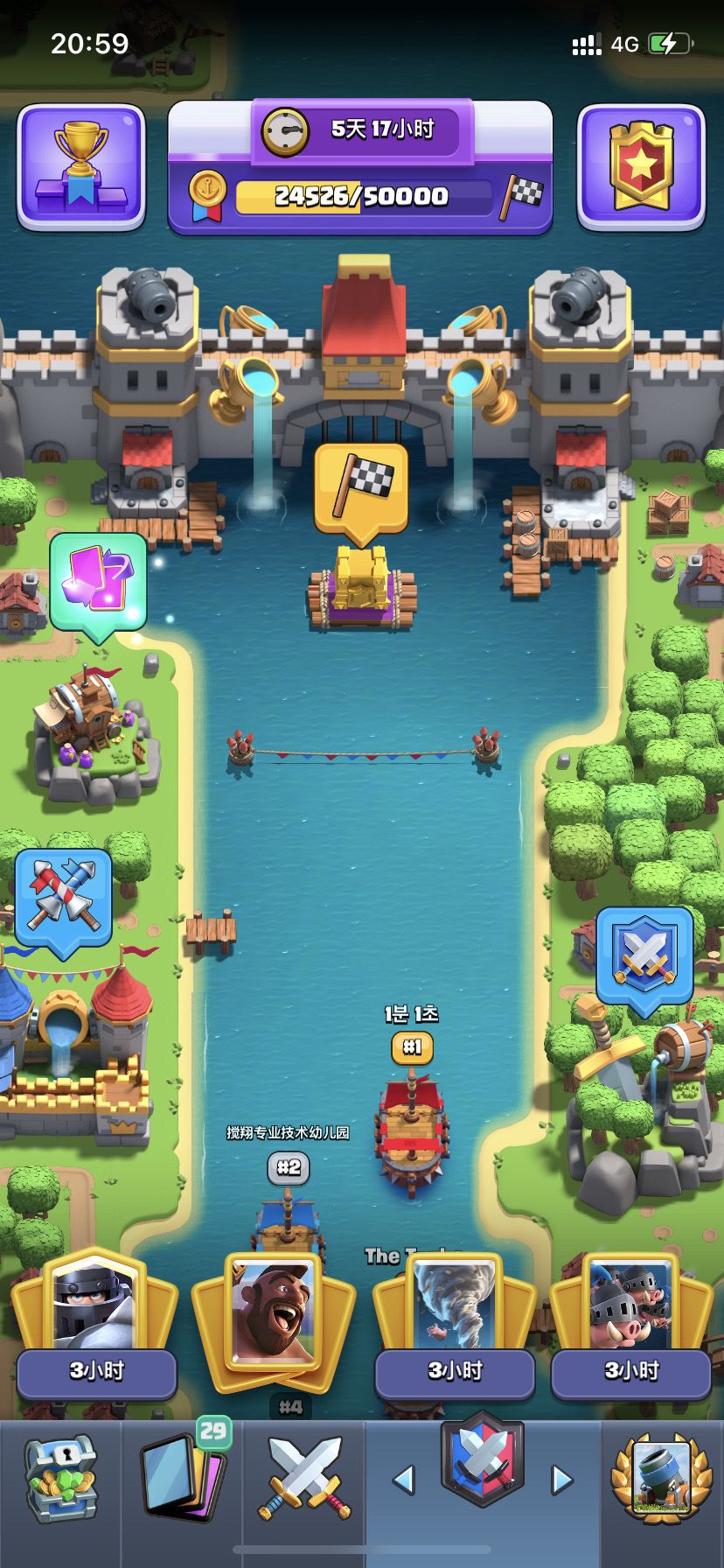 部落战2是以每周为一个周期,主要3个主要模式,PVE(打船),1v1,bo3(决斗)。部落在河道中竞速,率先获得50000奖章的部落会获得第一名,剩下的依此类推,没有完成河道竞速的部落也会获得战靴。 【卡组】