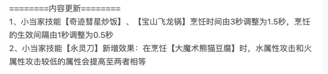 饰品部分在永灵刀新增在烹饪时,大熊猫魔术豆腐造成伤害后,水火属性中较低的属性会短暂提高到相等。注意因为是烹饪时,所以烹饪成功后地上留下的料理是不享受这个效果的。这里选择火属性饰品。