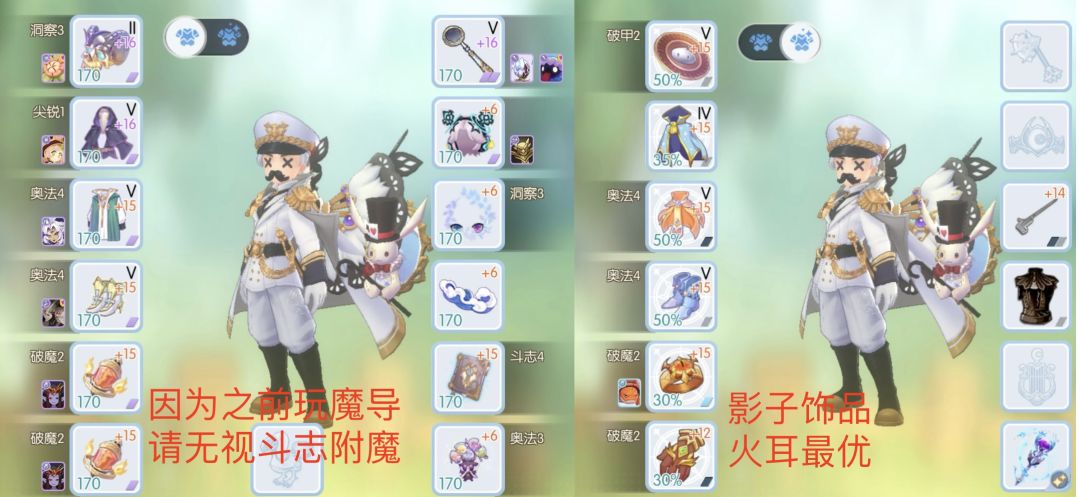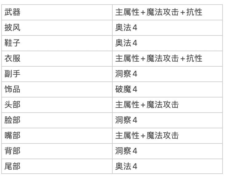由于法系配装大致都是一样的这里不再详细列出了,根据自己的卡片,附魔等实际情况选择远古副手破防/穿刺。影子部分也一样,奥盘和魔防书 2选一。我破防不够我选择的破防远古,大家根据自己情况配破防200即可。