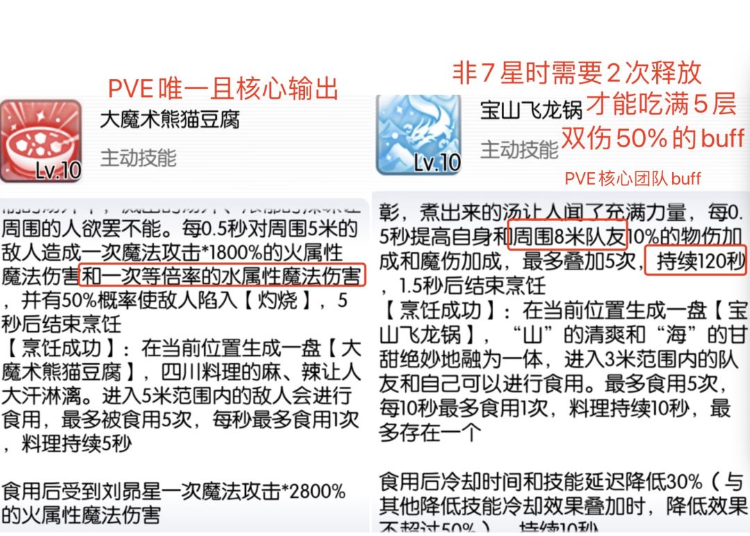 理由2,熊猫豆腐技能在烹饪完成后,地上的料理造成的是火属性攻击,虽然PVE中想输出的话基本是一直在不停烹饪大熊猫豆腐的,但是总会有放其他辅助技能的时候,这样可以保证烹饪间歇期时依旧可以享受到数值较高的火属性攻击。