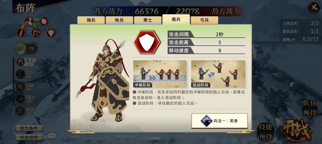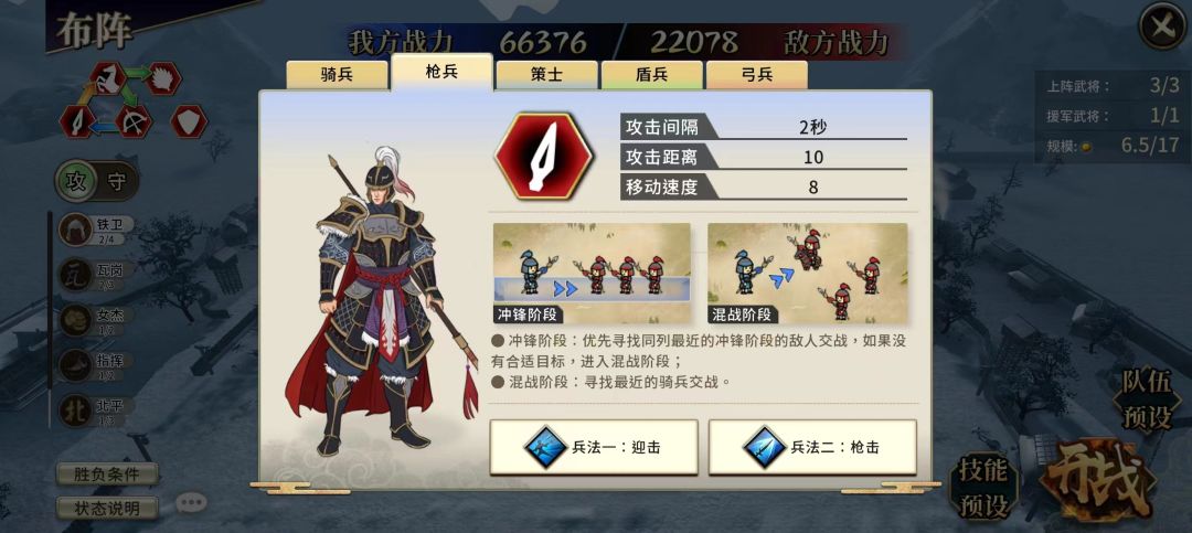 兵法特性1:未接敌时会举起长枪,此状态下与准备突击的骑兵接战,会发起一次“迎击”,对目标造成3倍攻击的真实伤害。
