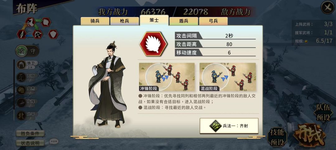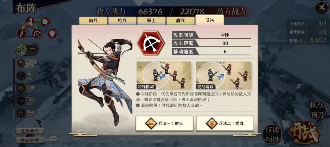 兵法特性1:普通攻击间隔是其他兵种的2倍,但每次普通攻击可射出5只箭矢,每只箭矢造成40%的武力伤害。