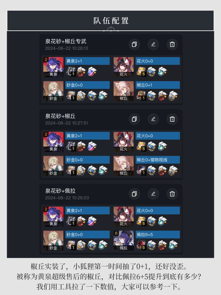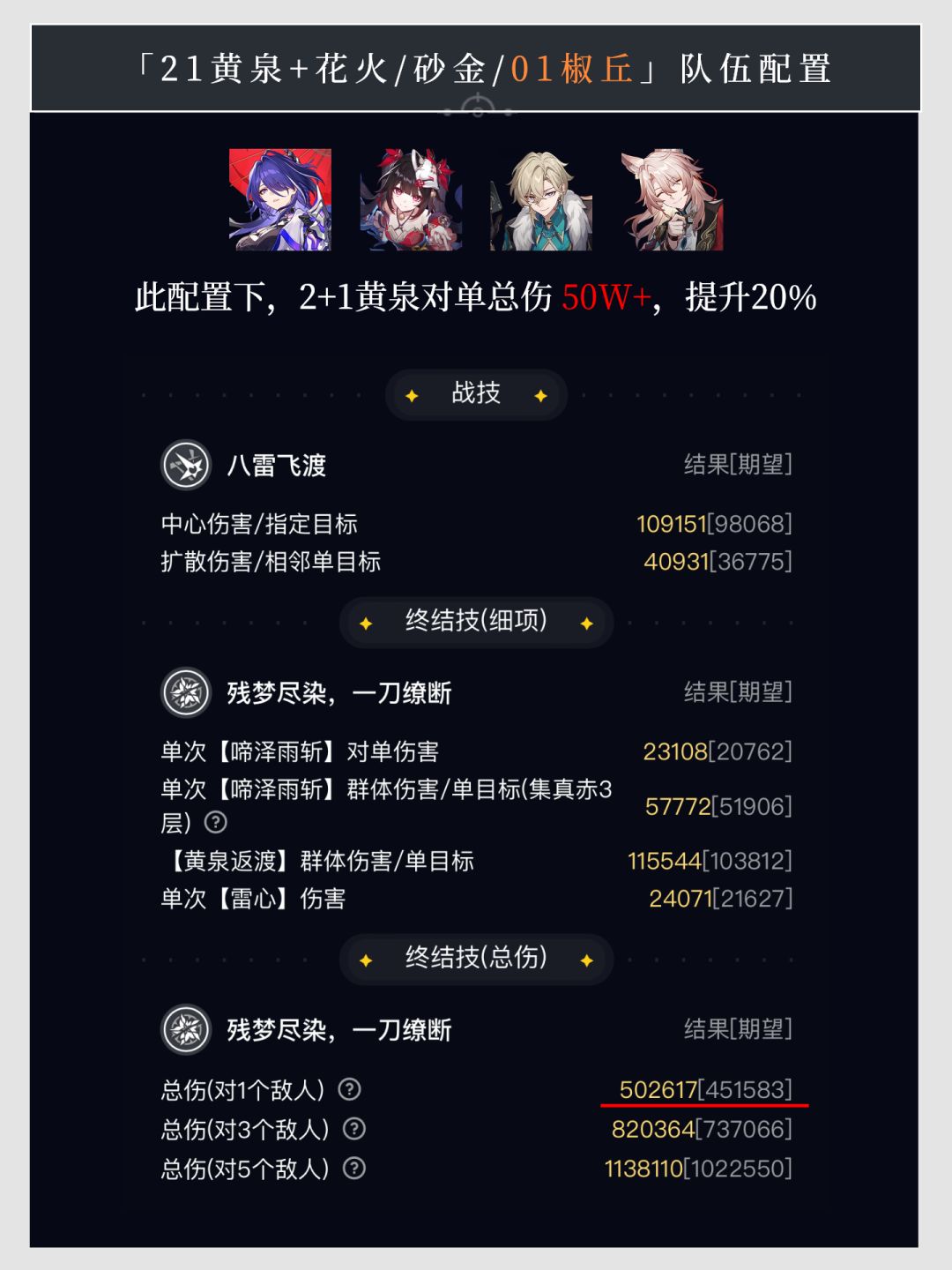 21黄泉+花火/砂金/01椒丘对单总伤50W+,提升20%