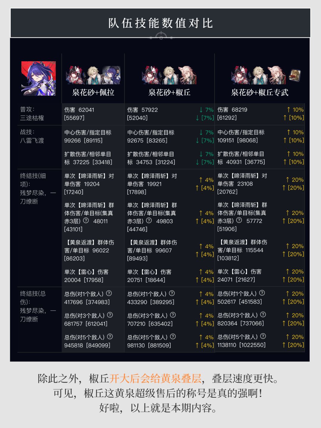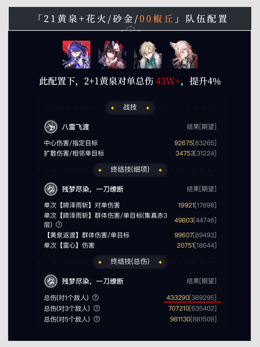21黄泉+花火/砂金/00椒丘对单总伤43W+,提升4%