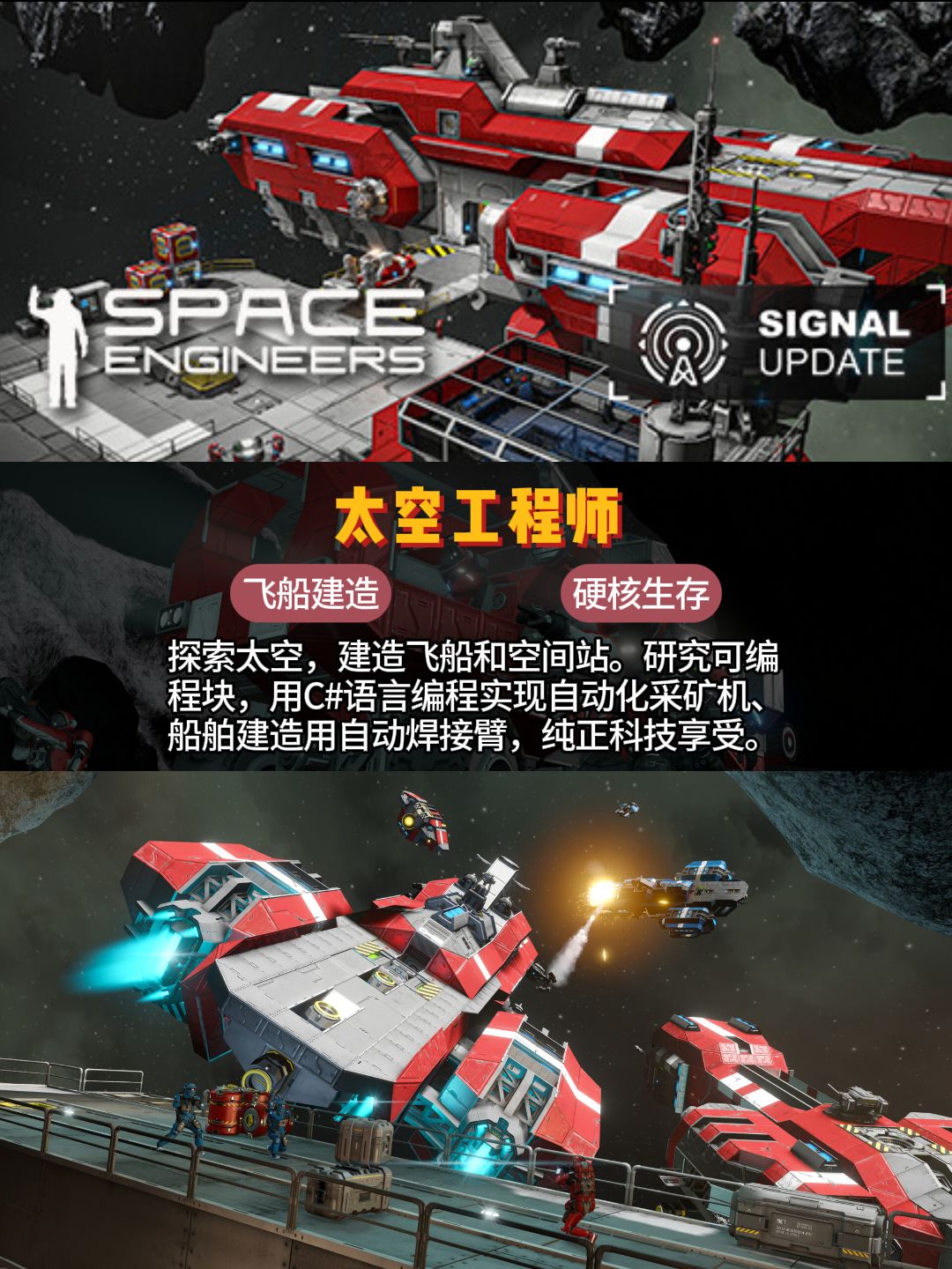 3. 《太空工程师》(Space Engineers)🚀 在浩瀚的太空中探索与生存!🌌收集资源建造飞船、空间站,一切物体均可拆卸、组装,真实的物理引擎让你体验到极致的游戏乐趣。🔧想制造自动化工具?🤖掌握C#编程是关键 ,Github上还有丰富的资料!对编程感兴趣的玩家绝不可错过!👩💻💡