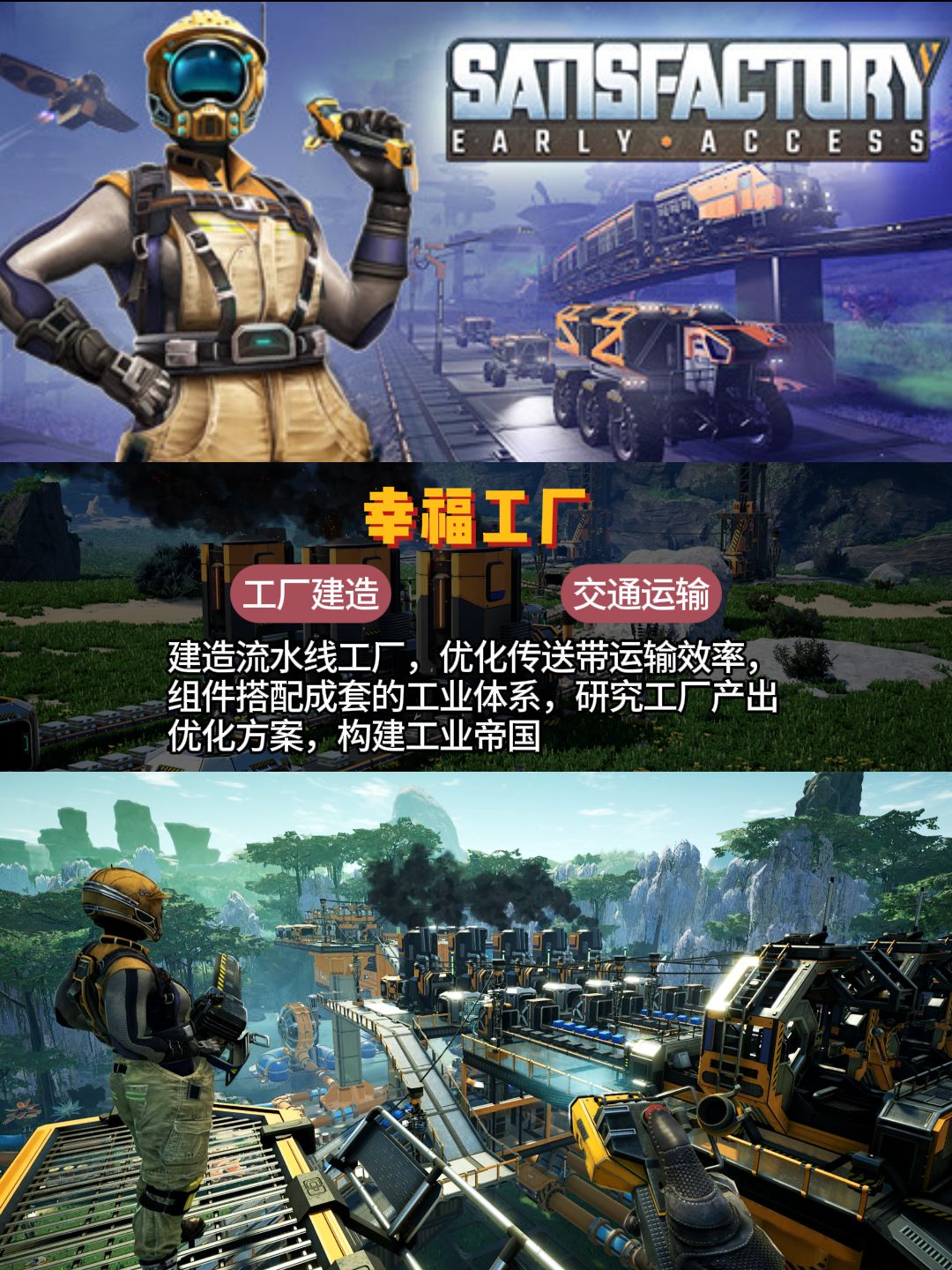 5. 《幸福工厂》(Satisfactory)🏭 体验第一视角的工厂建造乐趣!🛠️从手动制造到工厂流水线🤖,每一步都能带来成就感。通过优化铁矿处理与生产流程,打造超级工厂🏭。独特的交通运输🚂体系让你沉浸其中,游戏的好评自上线以来从未间断哦!👍👏