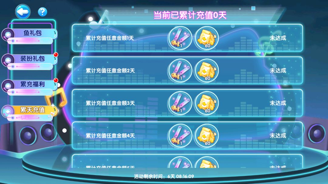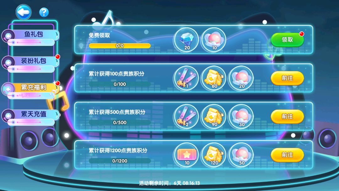 还能领取荧光棒(用于舞台打call抽奖)、音符币(用于商店兑换奖励)为舞台增加气氛~
