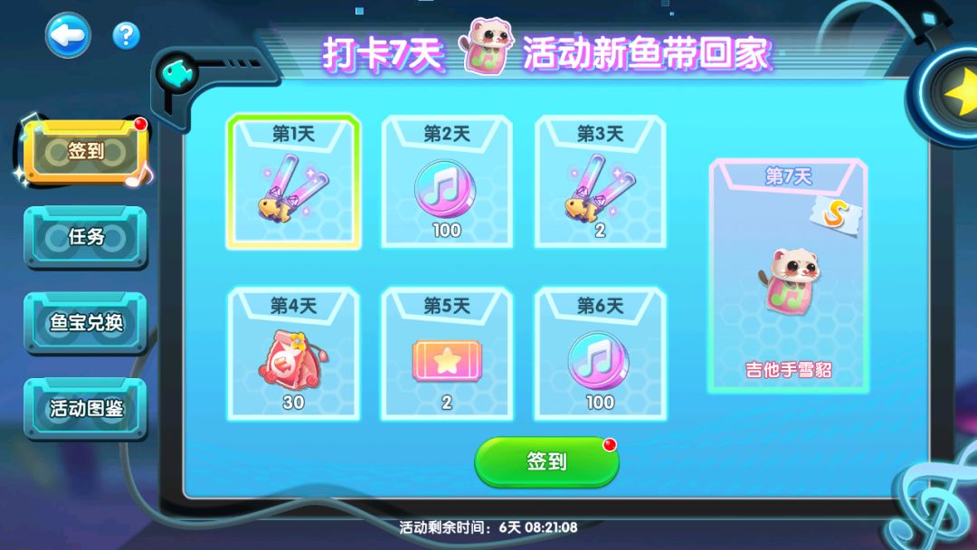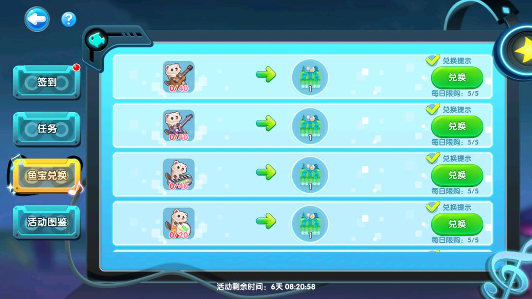 活动鱼宝也大有用处,完成鱼宝兑换可领取音乐豪华助力宝箱(内含荧光棒等道具)和音乐助力宝箱,加油产宝换宝箱多多~