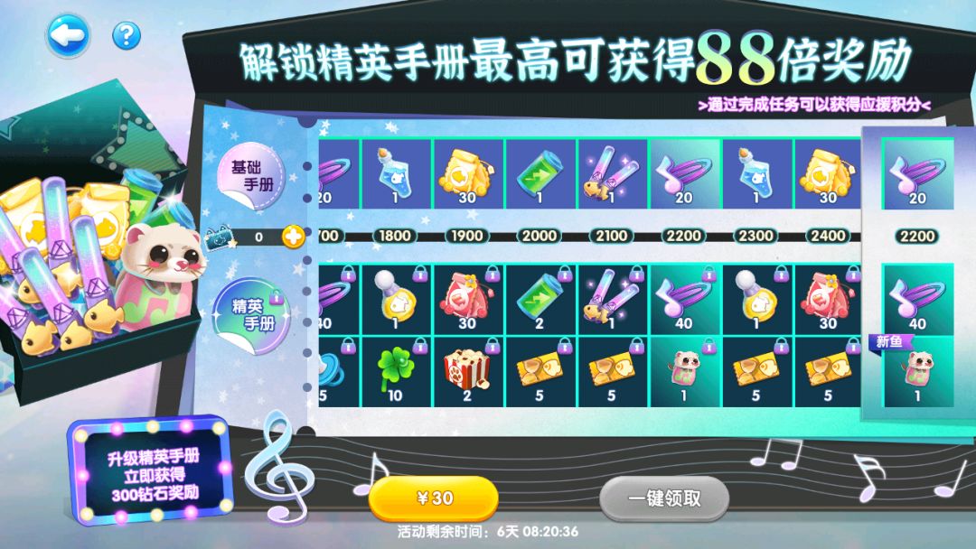 ②解锁高级手册立即获得300钻石,还可额外解锁新鱼吉他手雪貂等最高88倍奖励!