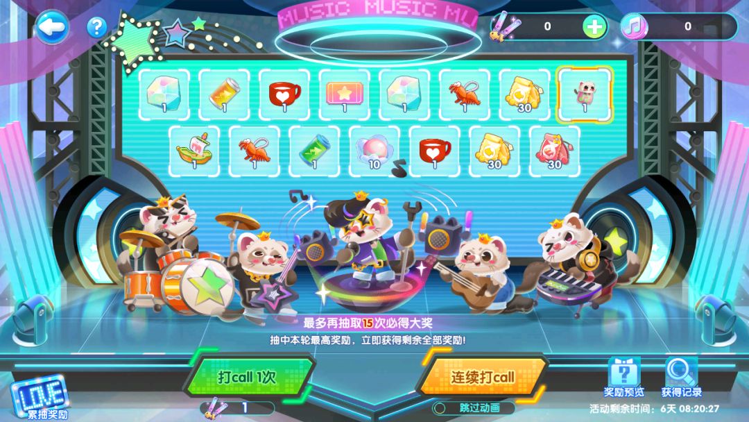 打call最高奖励为新鱼“吉他手雪貂”,抽中大奖剩余奖励可直接领取,每次打call还能获得相应的音符币!