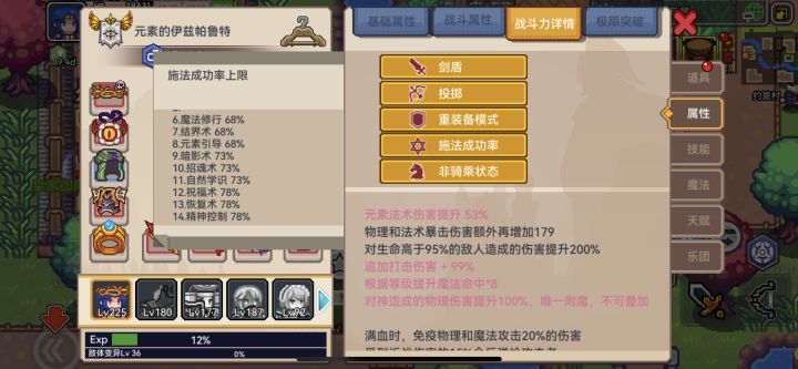 最后的描述有点复杂,结合下图解释,每个魔法种类的施法惩罚不一样,以下图所示,爆伤的计算为最低的施法成功率68%+7级秘宝35%施法成功率=103的施法成功率,因此爆伤就是多出的3点×4=12点爆伤。