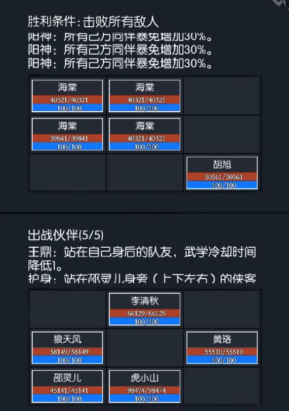 第九层第三战第一阵,四个海棠妹妹+胡旭,看了一下海棠是2技能药王神典,胡旭是1技能,蛮厉害的,消耗流,黄络降降防,肉盾抵住,等狼+灵儿起来慢慢抽死对面。这五个组合其实万能公式,花里胡哨的都能套。