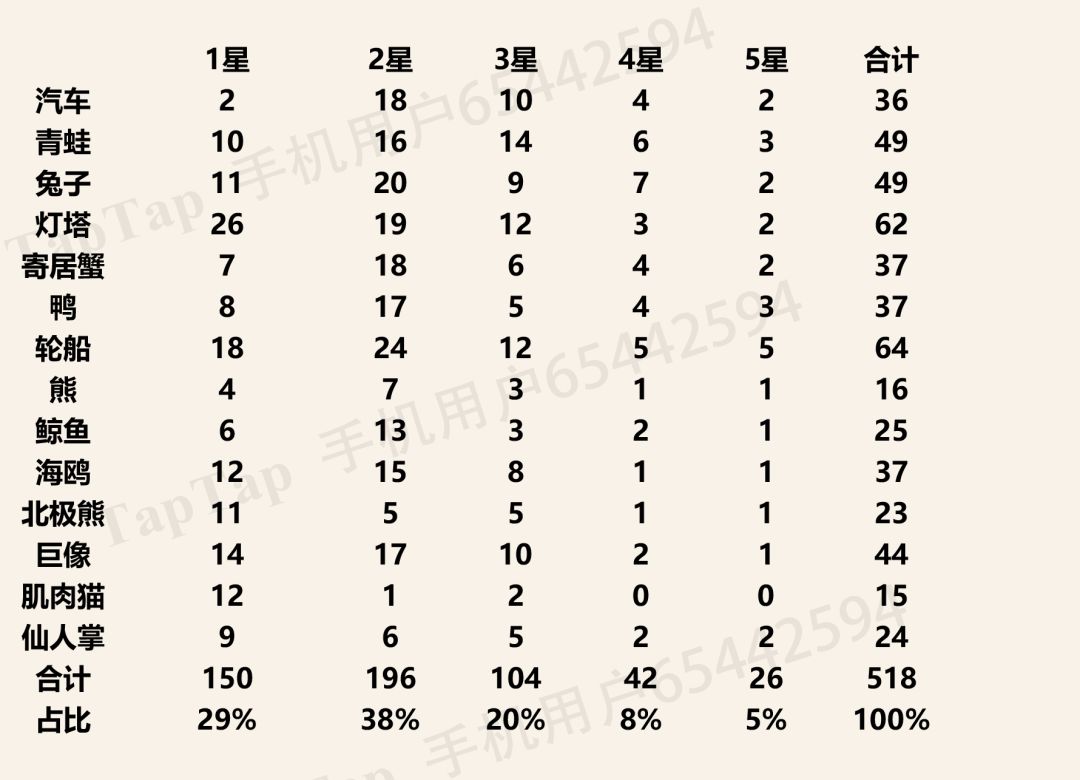 合计制作518个沙雕,其中1⭐占比约30%,2⭐占比约40%。5星占比约5%。