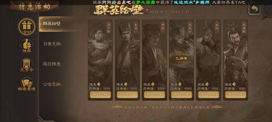 本期群英绘壁的6位武将分别是谋于禁、袁涣、费祎、羊𧙖、谋虞翻、谋赵云,除了谋赵云是之前群英绘壁的武将以外,其他的5位武将都是新的群英绘壁武将,还是非常不错的,那么将军们为期长达250天的劳动合同又来了。
