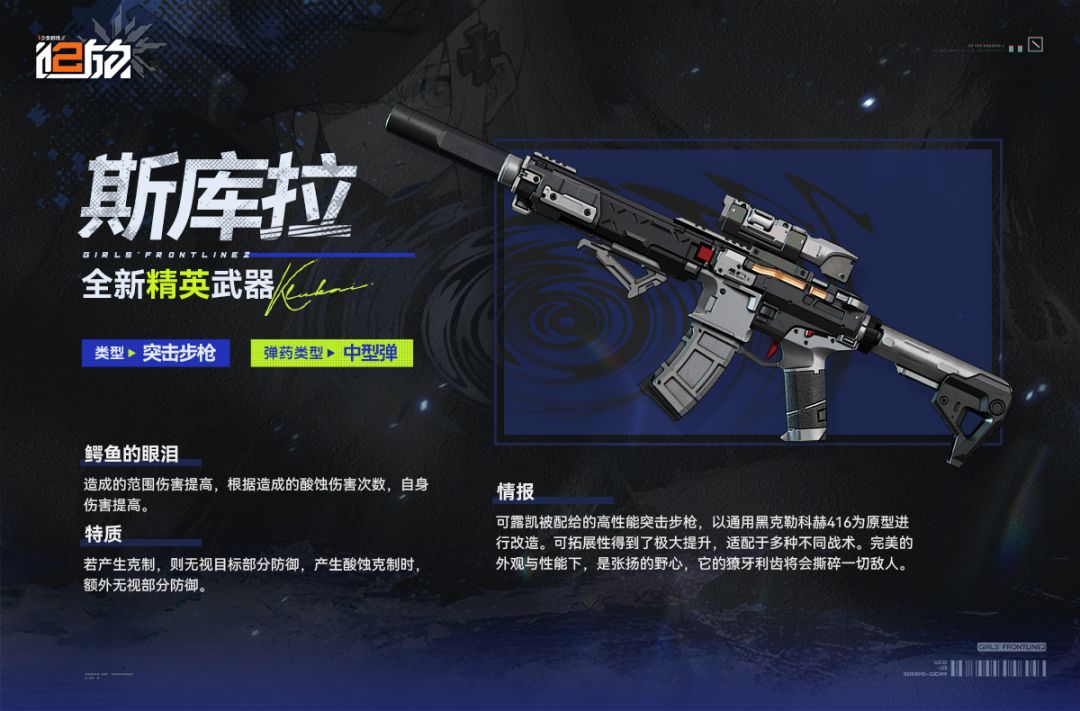 可露凯被配给的高性能突击步枪,以通用黑克勒科赫416为原型进行改造。可拓展性得到了极大提升,适配于多种不同战术。完美的外观与性能下,是张扬的野心,它的獠牙利齿将会撕碎一切敌人。