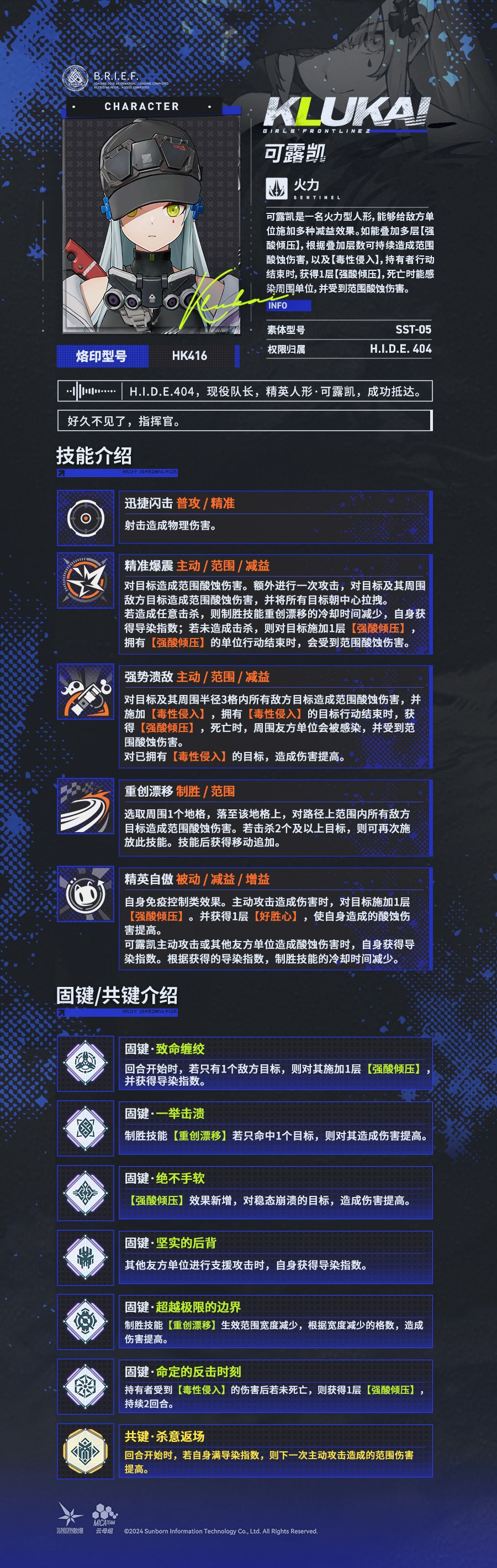 可露凯是一名火力型人形,能够给敌方单位施加多种减益效果。如能叠加多层【强酸倾压】,根据叠加层数可持续造成范围酸蚀伤害,以及【毒性 侵入】,持有者行动结束时,获得1层【强酸倾压】,死亡时能感染周围单位,并受到范围酸蚀伤害。详情请看下图。