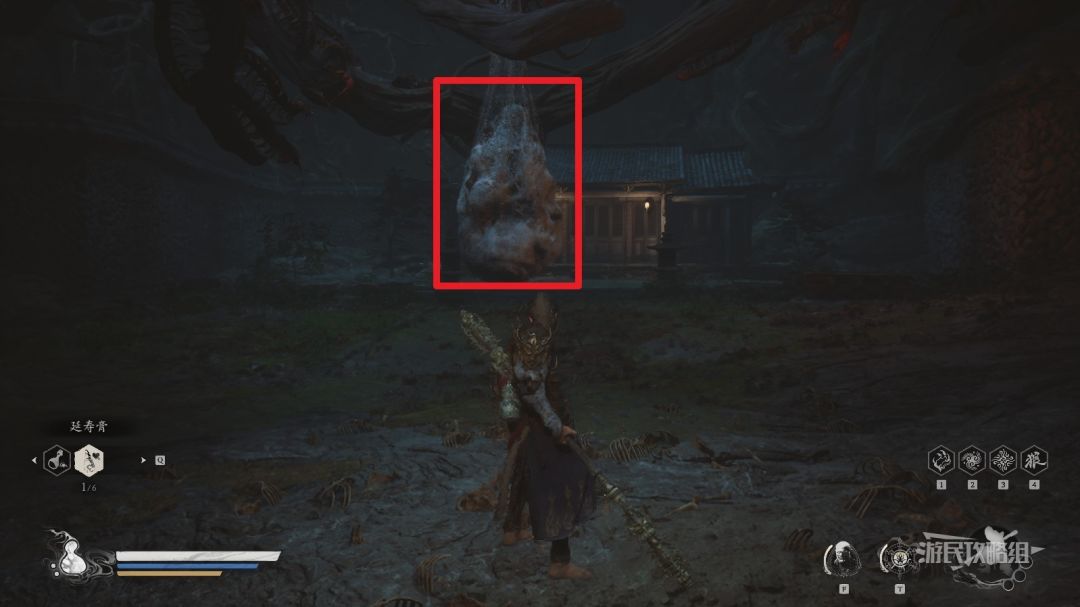 一路穿过顶上吊着的利爪茧,到达最前方有一个很大的茧,敲一下会触发与【怪茧】的BOSS战,黑手道人就在茧里。