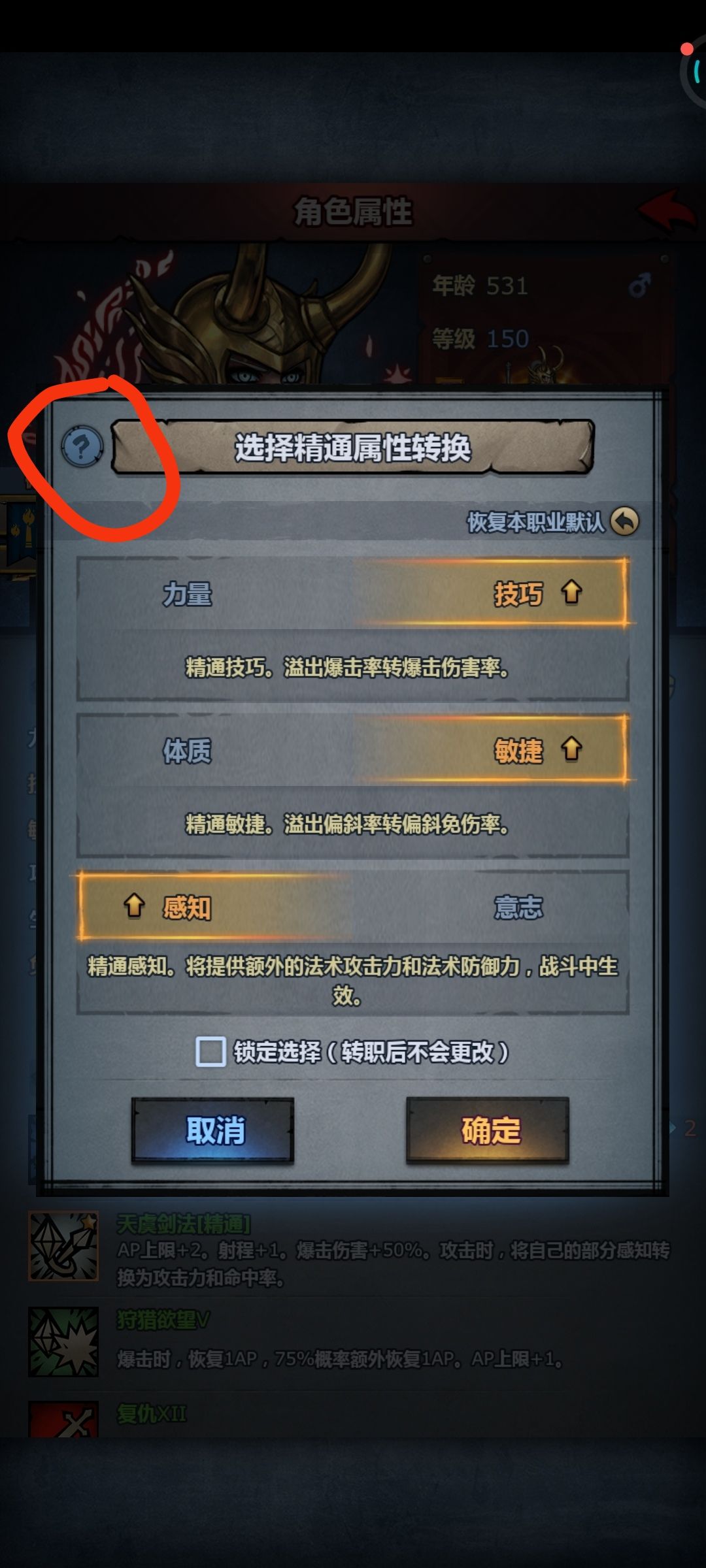 职业精通后的转换详情可以自己点进去查看。简单来说就是力量转物攻,技巧转爆伤,体质转生命,敏捷转偏斜,感知转法伤法防,意志转法抗,剩余负重转物防)
