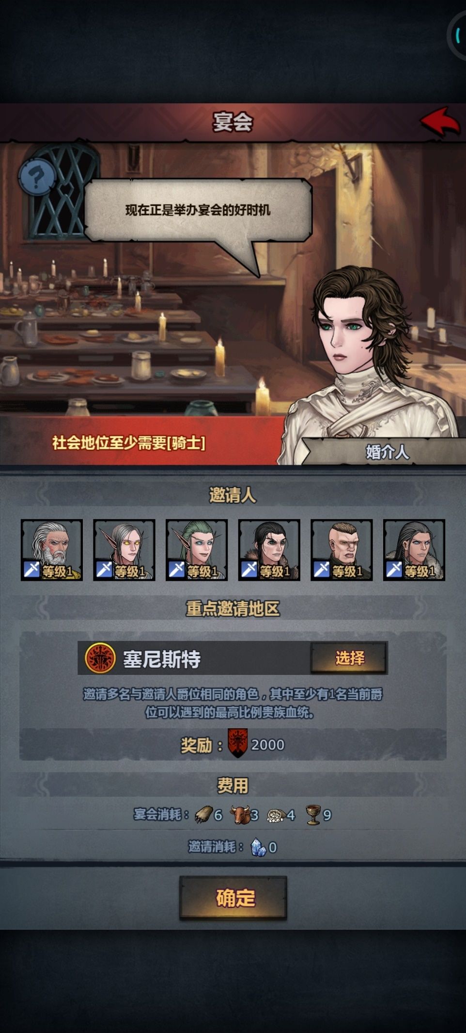 1,骑士宴会拉满,骑士宴会是刷声望性价比最高的,骑士宴会不消耗金面包,只需要一点点的材料就可以获取大量声望。(PS:宴会问题的三个选项不用纠结,不影响结局,随便选就行。让你回去等信息就是成了,没成就是加钱环节。实在想强娶(除了公爵其他爵位不是很建议强娶),选第一个就行,不要选第二个用水晶,很亏)