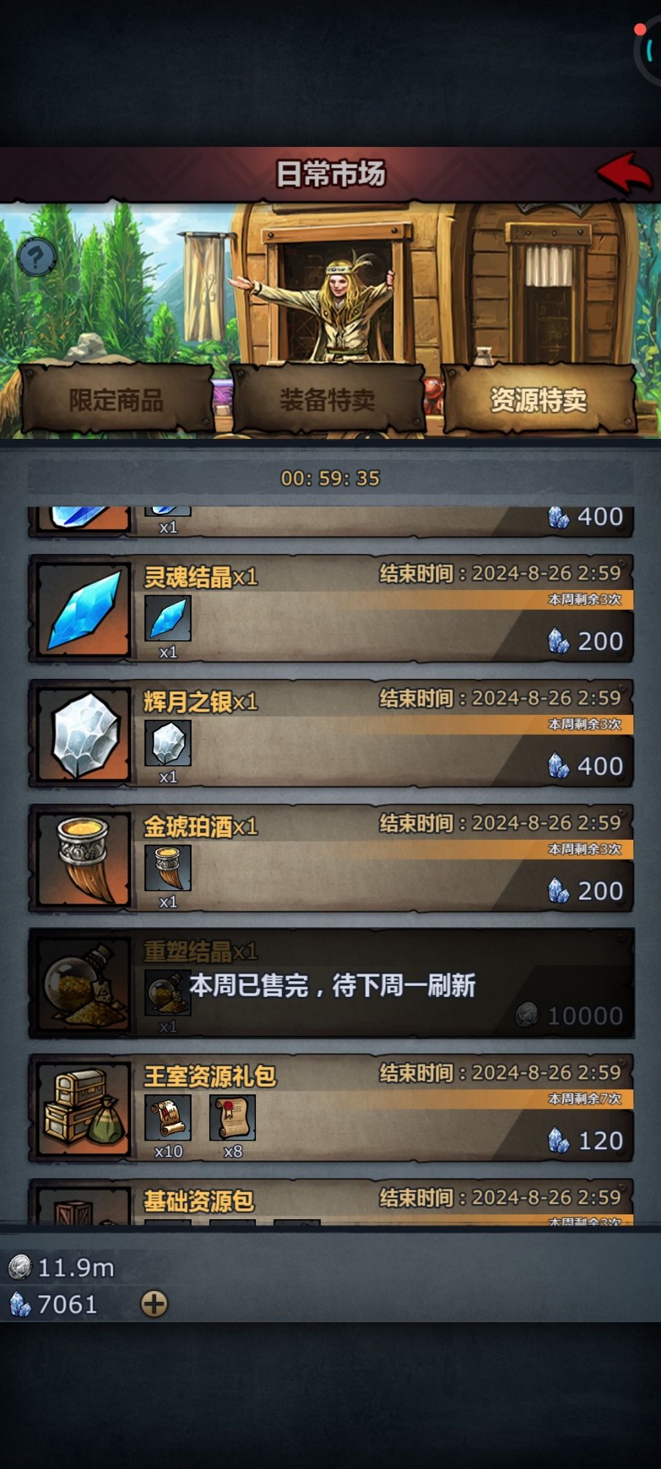银币的每周限购,重塑结晶买满,3W一份的大理石红檀木看自己需要。