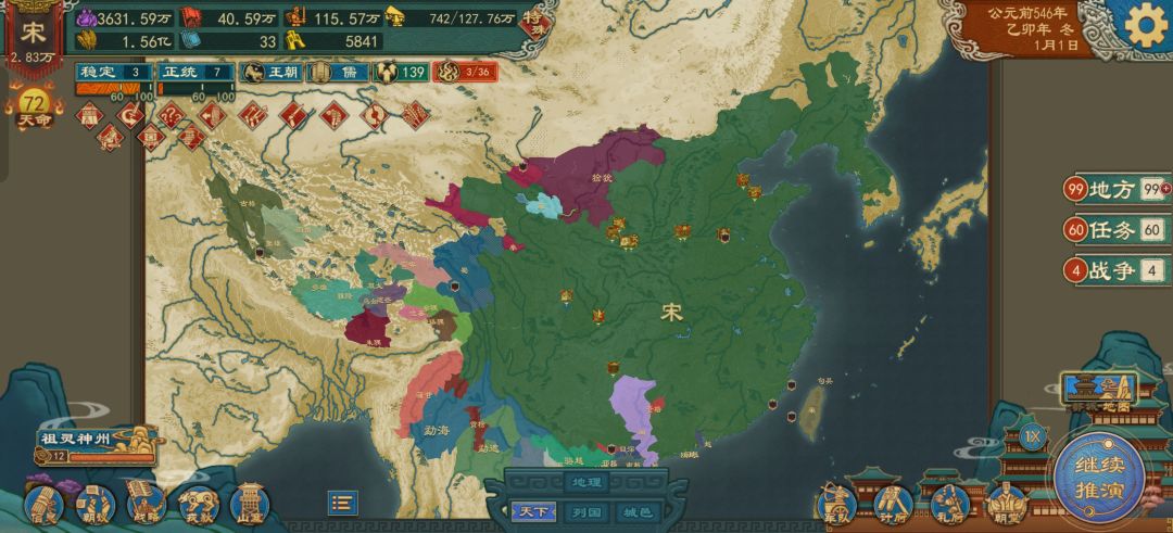 核心地区和江南全叛了,剩下的叛心也都六十往上,然后有了负面buff君威更上不去,叛军战力全拉满而且都城还在最里面 ,天命本来都99.6了,一朝回到解放前,再稳稳估计还能打,但我还是选择从之前存的560的档重新打,太麻烦了,