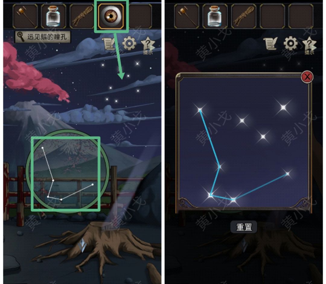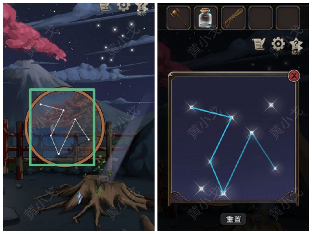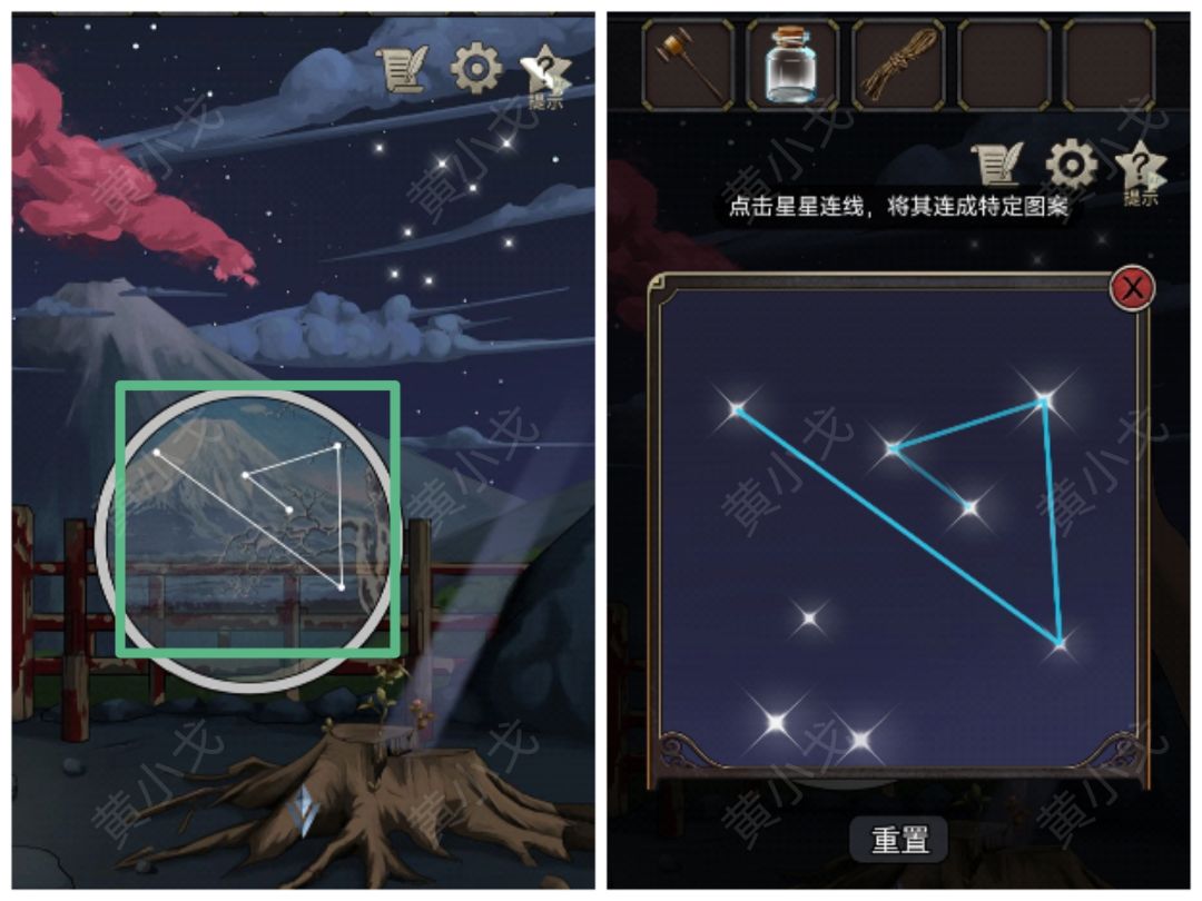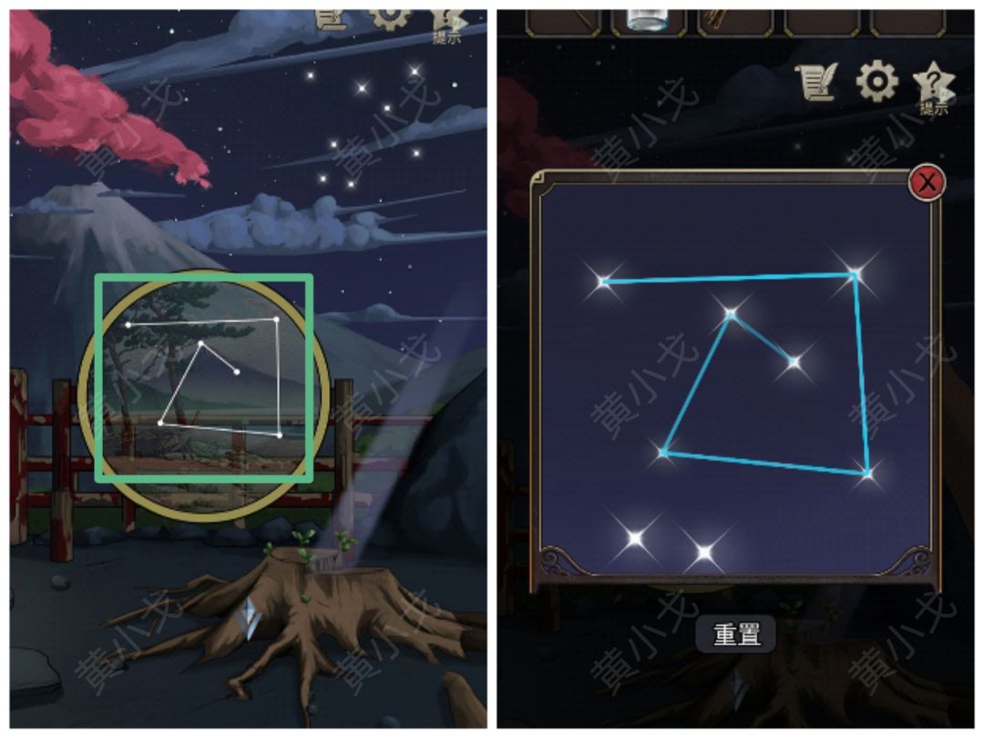5.对天空的星星使用【远见蝠的瞳孔】,根据圆圈里的星象,完成星星连线小游戏(四季树桩裂缝中长出了绿色小芽)