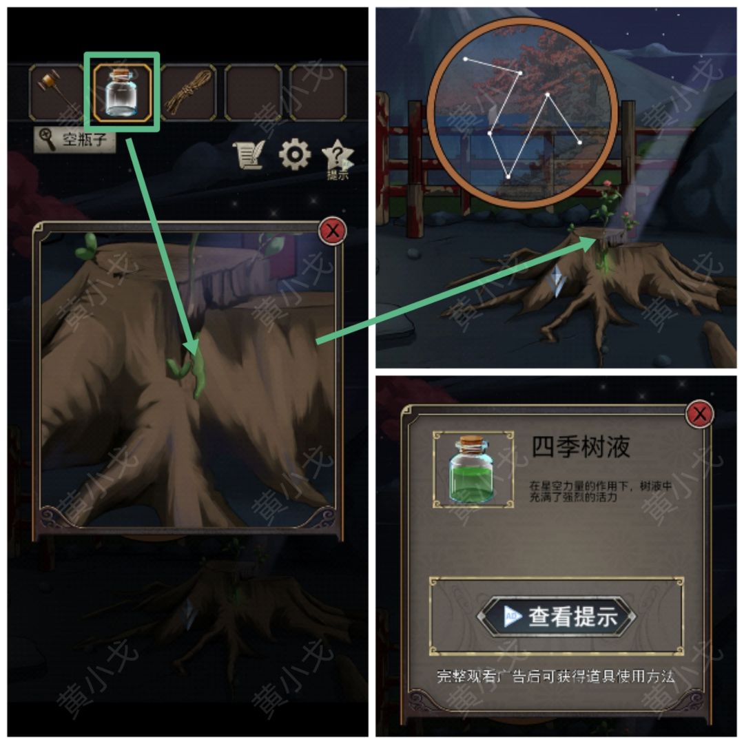 7.点击四季树桩,用【空瓶子】装渗出的绿色液体,获得【四季树液】