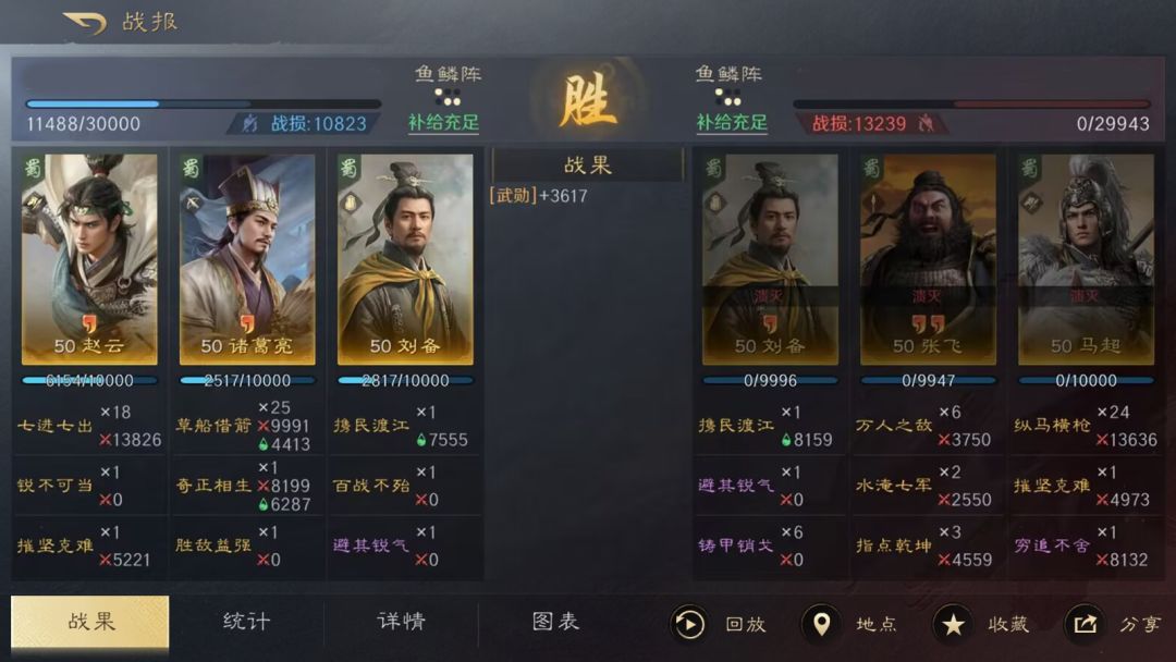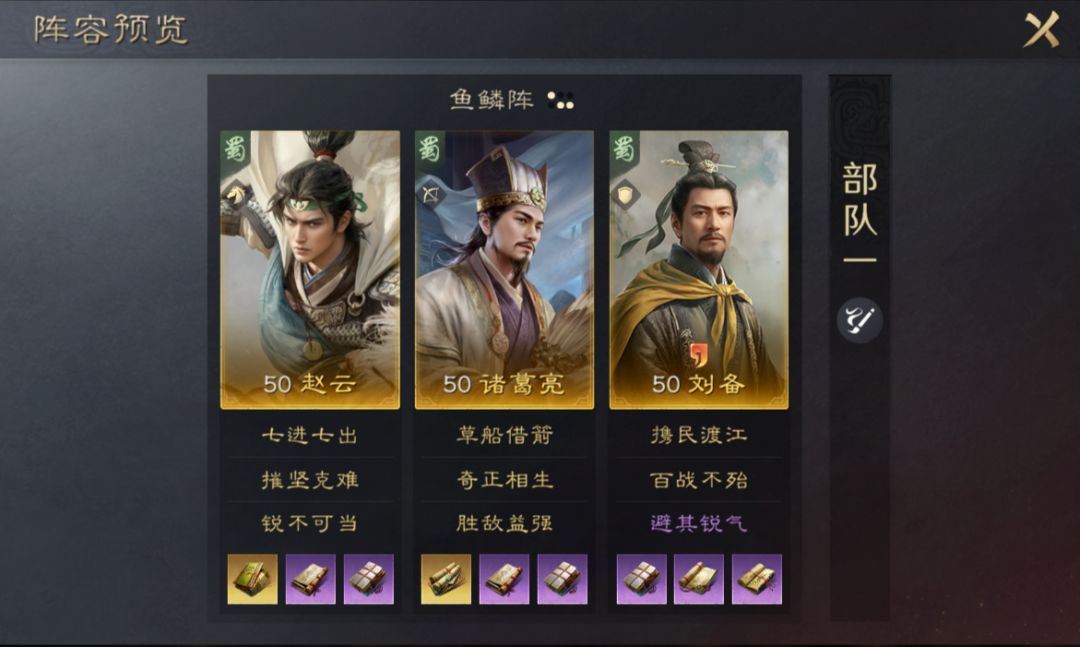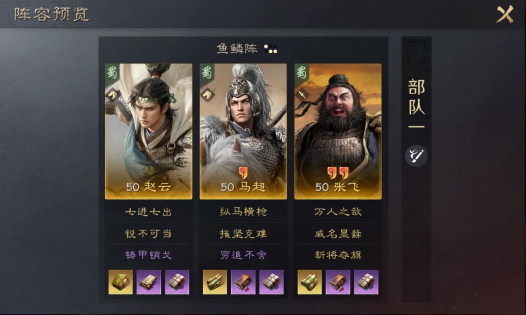 该阵容可触发五虎上将缘分效果增加会心率,再搭配上鱼鳞阵,让赵云的规避和马超的会心都能够有最大收益,马超在战法【摧坚克难】、阵型、缘分以及韬略的加持下,会心率可以大幅提升,爆发能力十足。