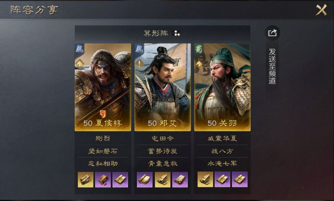 该阵容利用邓艾前三回合的全体减伤效果,确保夏侯惇能够减少更多敌军伤害,目前谋略型输出队伍较多,关羽携带韬略《王预》后在受到谋略伤害后可以提升战法发动率,从而能够保证自己输出能力,在对战略型输出队伍时会有奇效;该阵容属于一类体系搭配,关羽也能换成大多数核心输出武将,比如郭嘉,陆逊,夏侯渊等。