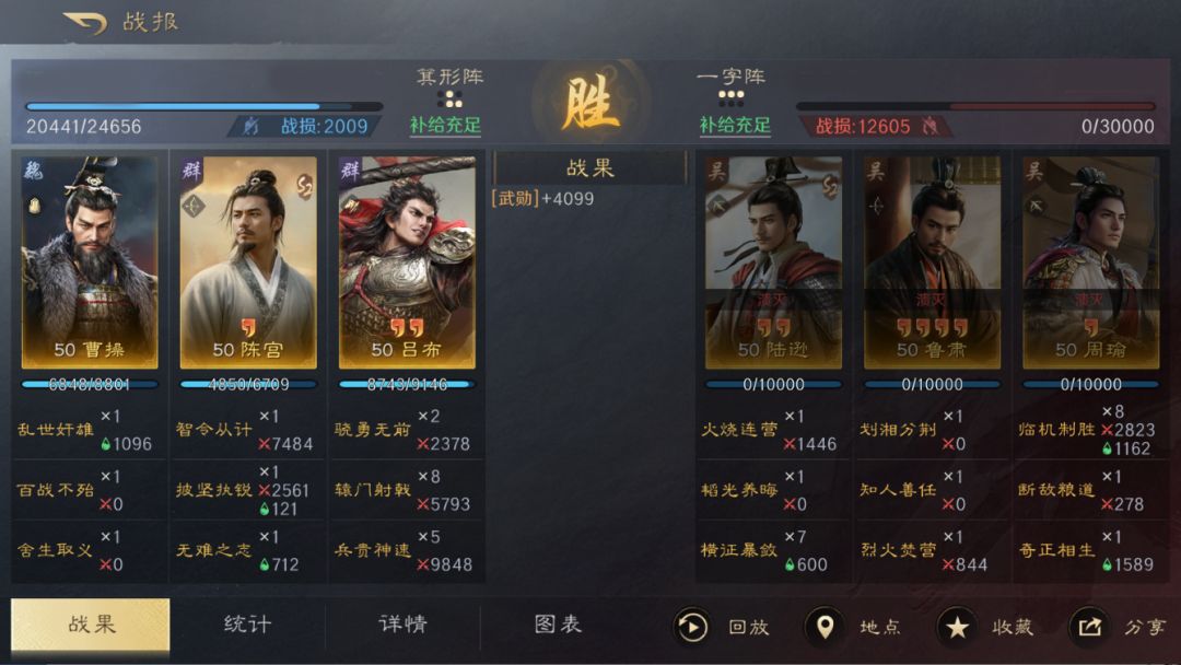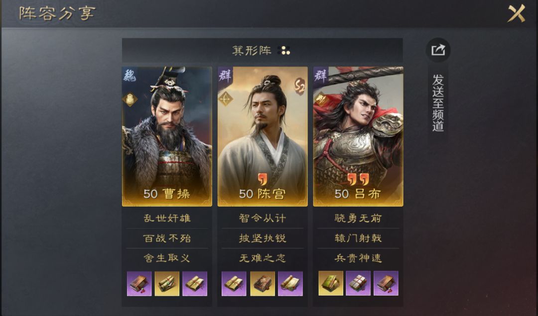 该阵容舍弃了方圆阵,选择箕形阵增加伤害,携带【舍生取义】+【无难之志】保证吕布的连击率,吕布触发追击战法的同时,可以获得陈宫自带战法【智令从计】带来的“从计”状态,造成大量伤害,【舍生取义】也能够保证吕布不被控制,也进一步提高了阵容的稳定性。