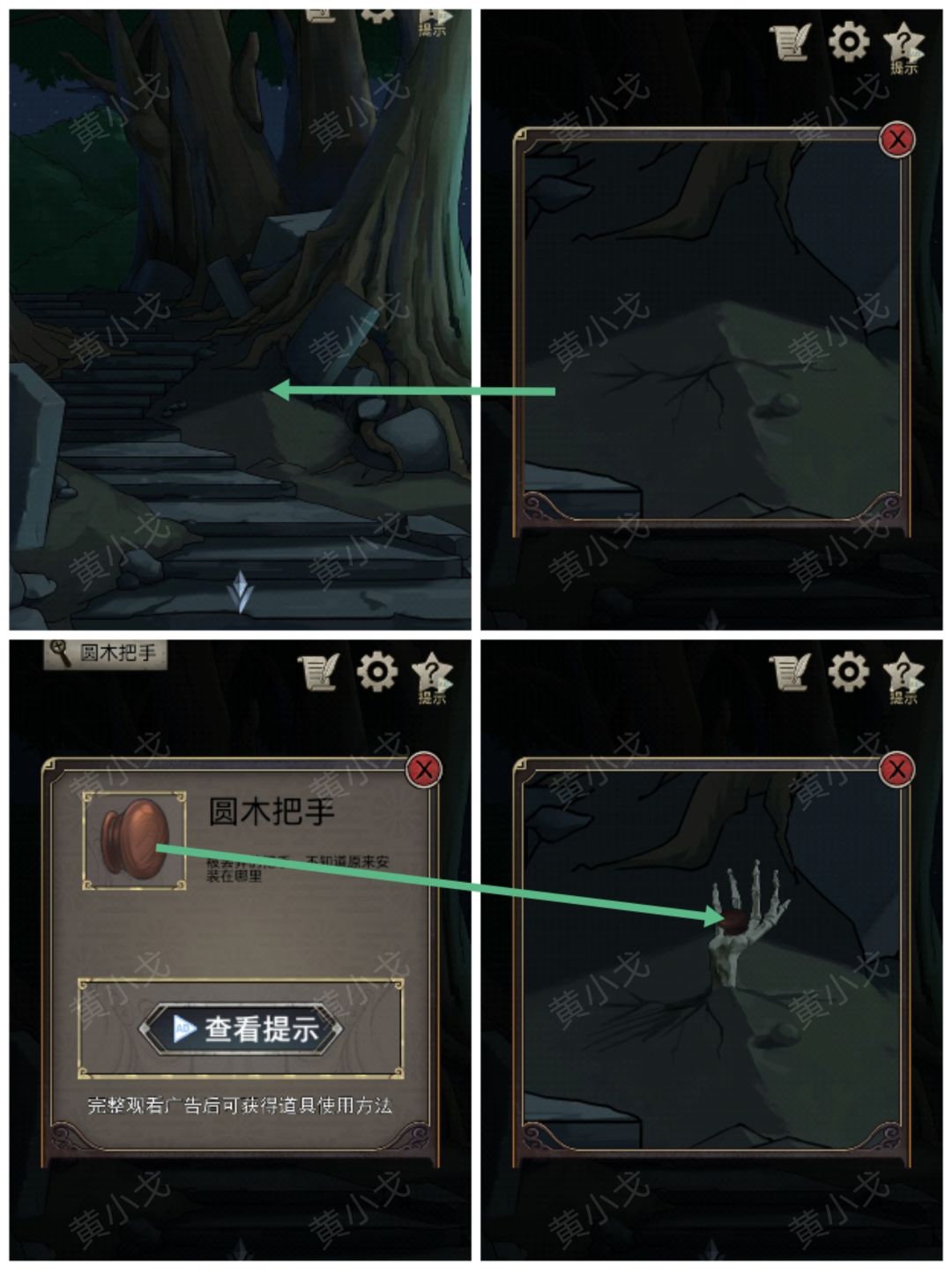 1.(井)点击树旁边的裂痕,在骷髅手上获得【圆木把手】