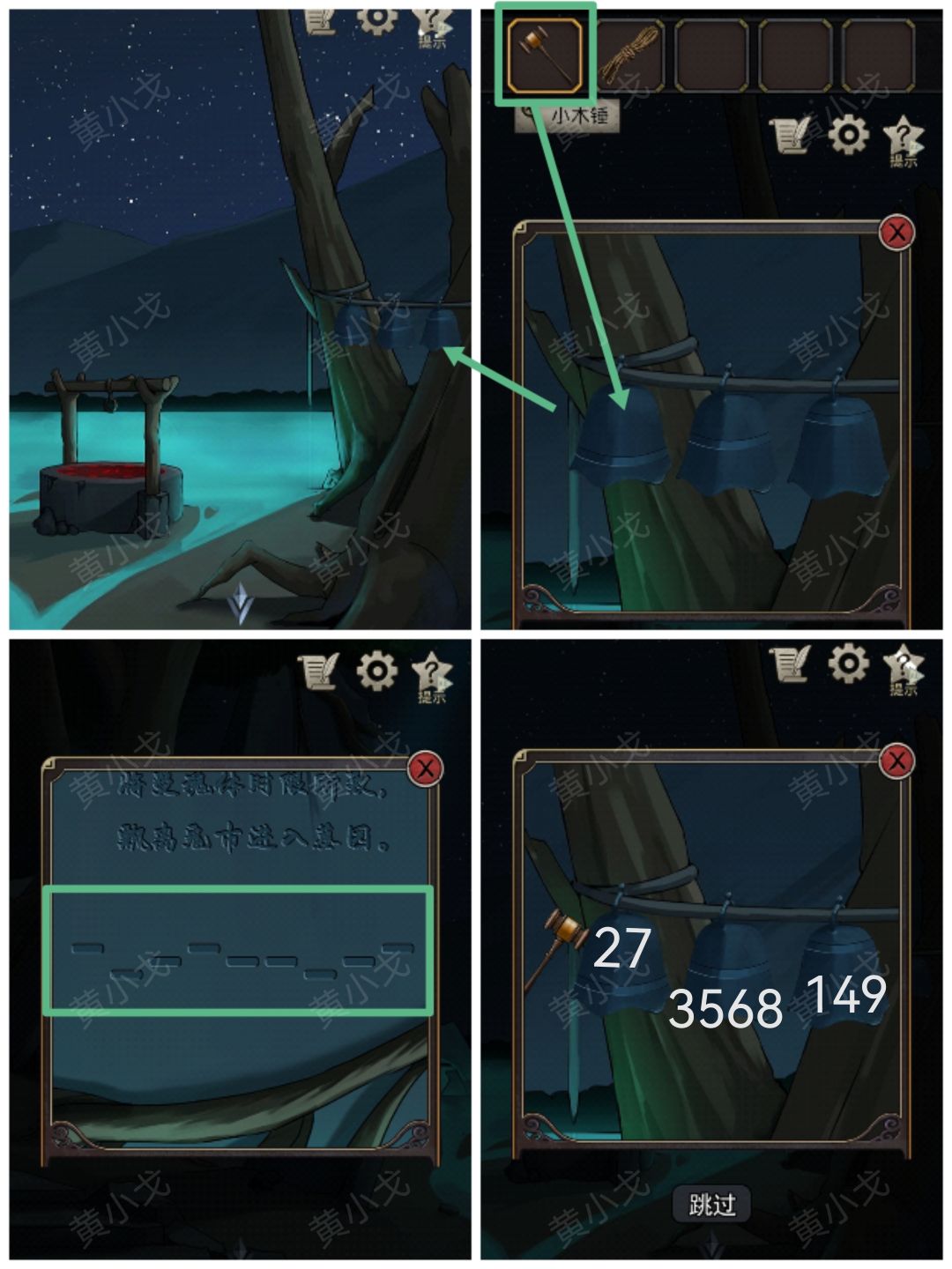 3.点击树上的钟,根据石碑上的符号,用【小木锤】按(312322123)的顺序敲钟(按照乐谱用小锤子敲钟)