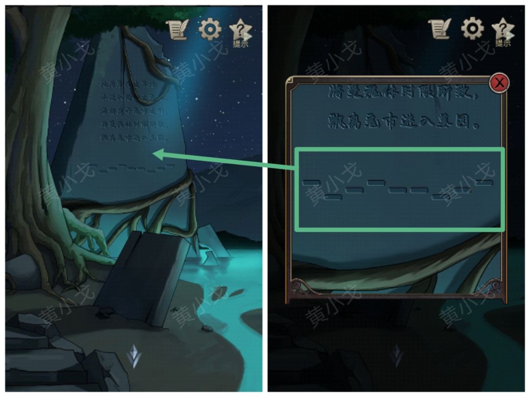 2.点击查看石碑上的字及符号(要完成第三章星象小游戏树上的藤蔓才会消失,切换到春季就可以啦)