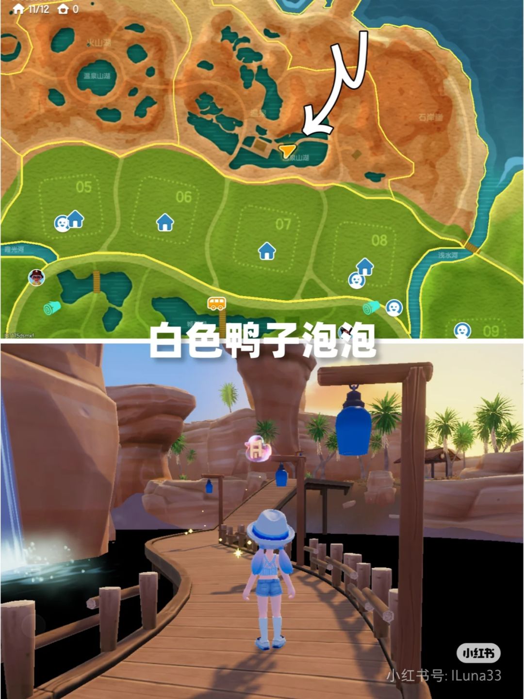 5.今日小黄鸭位置:茶色鸭子泳池背面!白色鸭子泡泡在温泉山湖桥上!